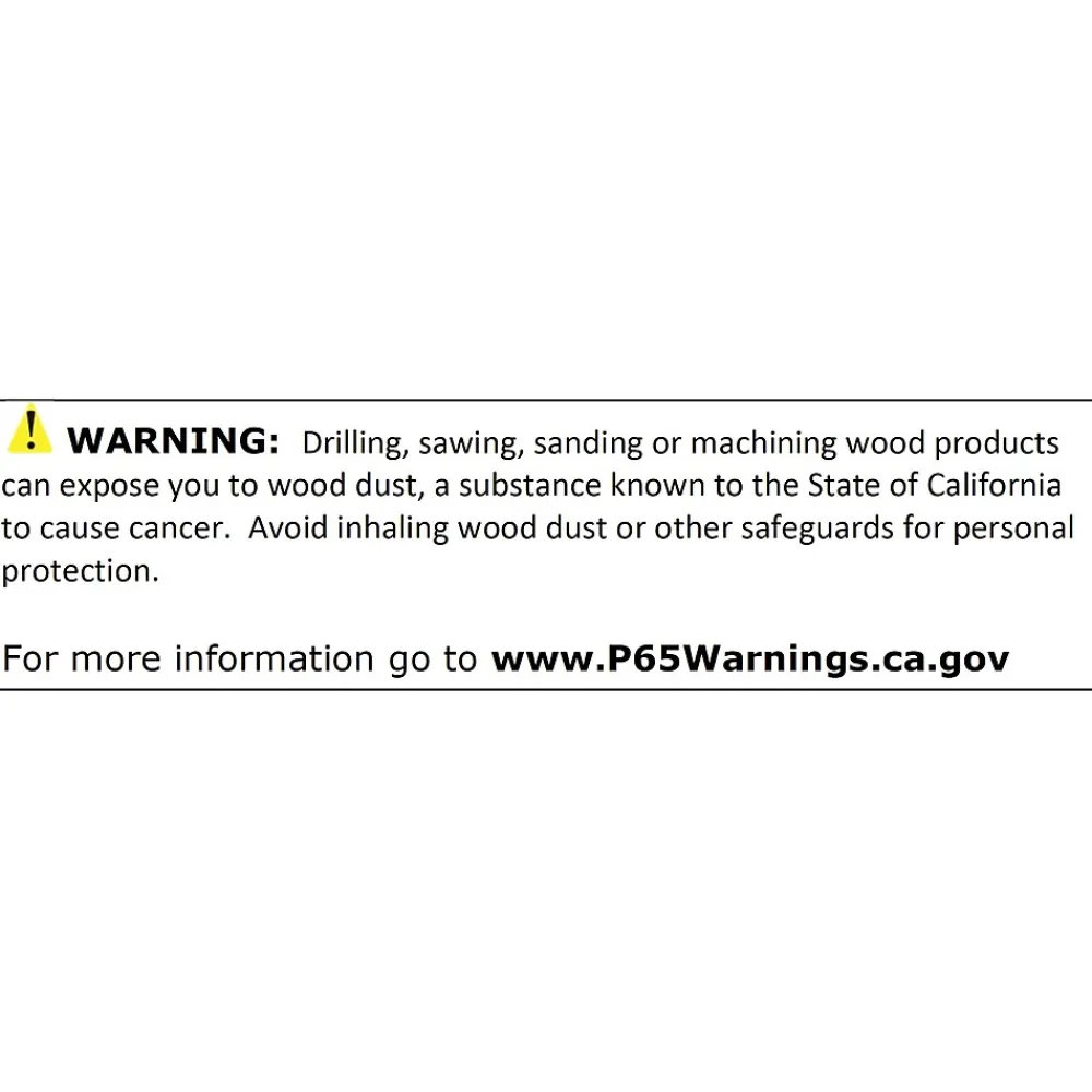 - ⚠ WARNING: Drilling, sawing, sanding or machining wood products can expose you to wood dust, a substance known to the State of California to cause cancer.Avoid inhaling wood dust or use a dust mask or other safeguards for personal protection.For more information go to www.P65Warnings.ca.gov