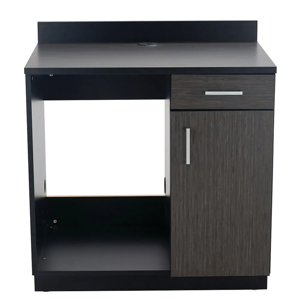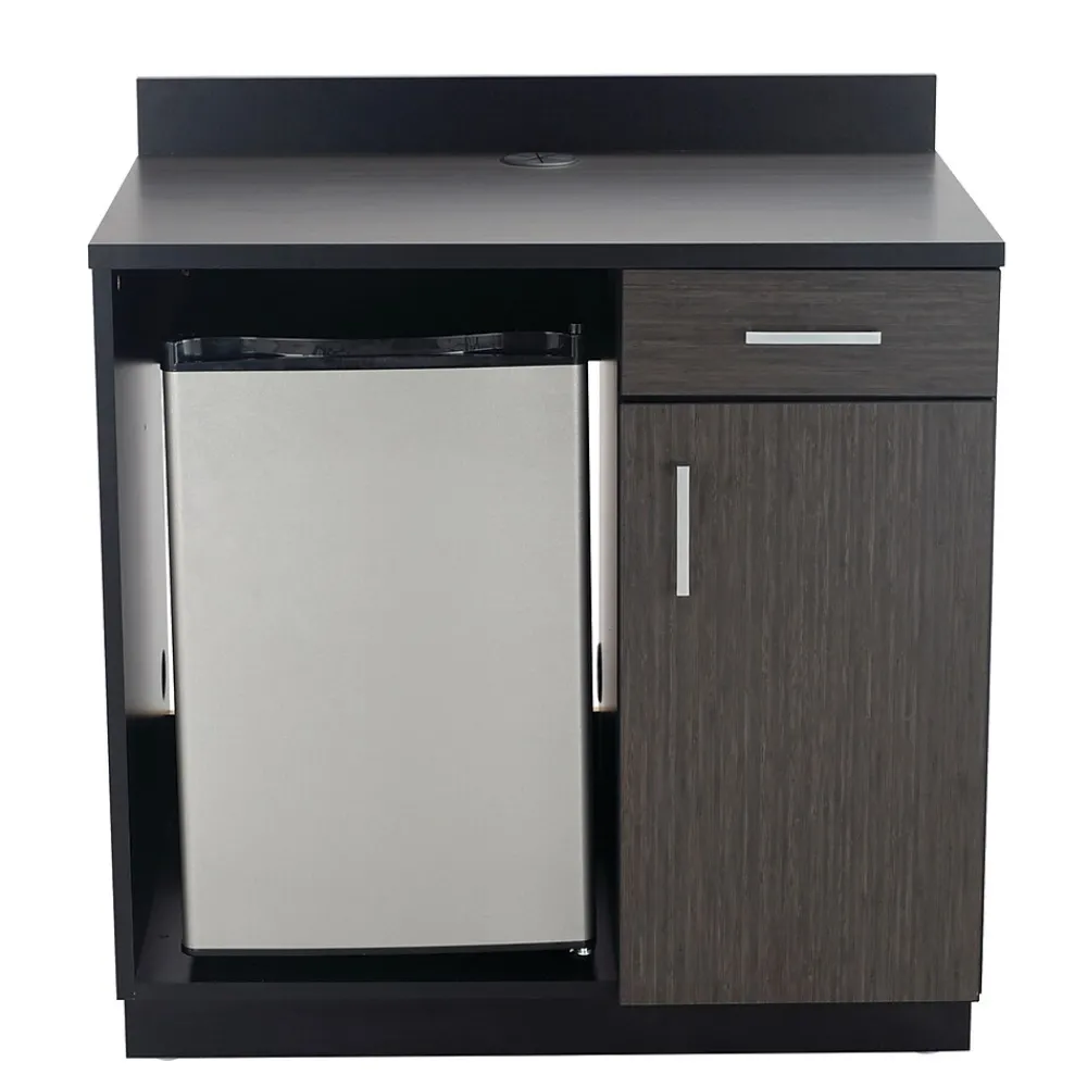 Modular, multiuse base storage cabinet for custom storage in workspaces, breakrooms and classrooms. Cabinet comes with 1 small task drawer, 1 cupboard, and an open storage compartment. Cabinet panels constructed from ¾” thick TFM laminate that is heat, moisture, stain and abrasion resistant. Drawers feature soft, self-closing mechanisms. Cabinet interior, side panels, backsplash and PVC edgebanding are Black with Asian Night finish cabinet exterior and countertop. Ships Ready-to-Assemble.