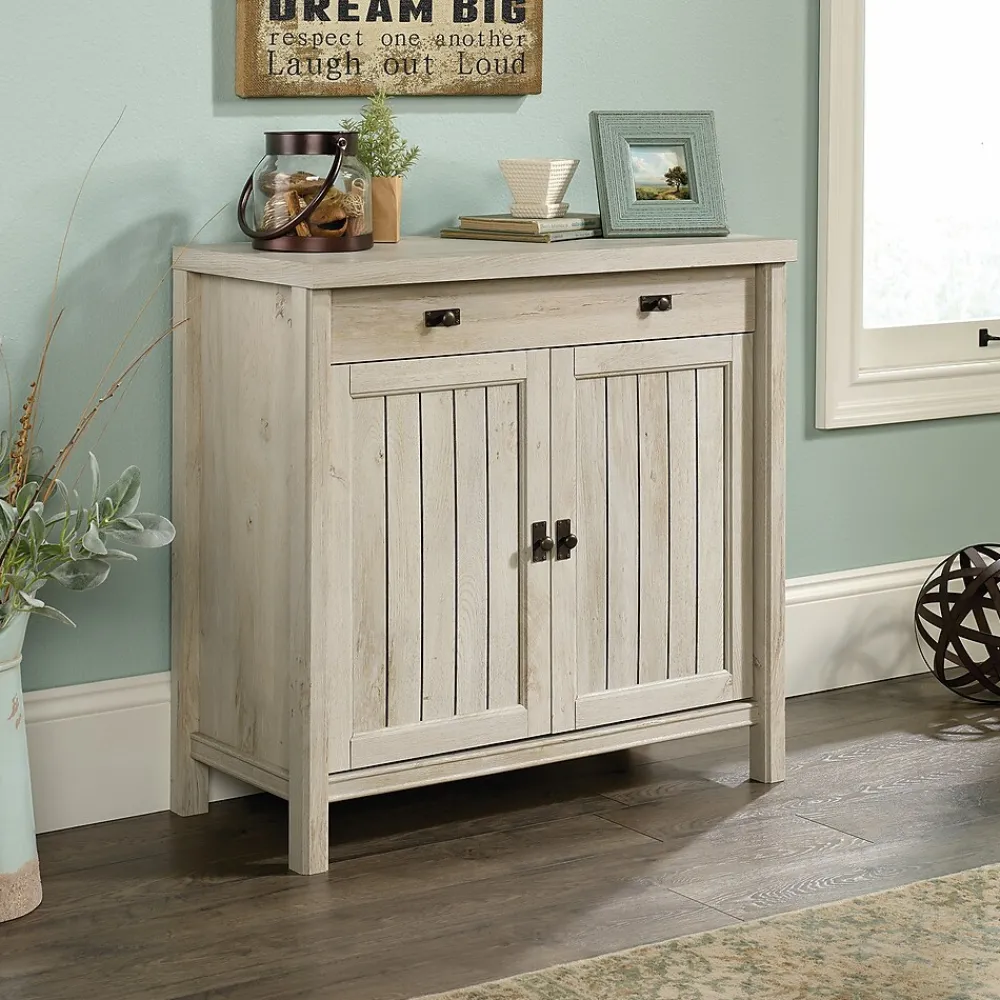 Transform your home into a cottage-inspired retreat with this library base from the Costa collection. This beautiful cabinet features a durable, 1” thick table top with a spacious surface to display all your around home décor – an accent lamp, photos of family and friends, and a jar of seashells. Its large drawer opens and closes on smooth metal runners, making it perfect for easy access storage of small office supplies and clutter. Behind its double doors is a hidden storage area that includes a spacious adjustable shelf for convenient storage and organization. The frame and panel doors feature slat-front detailing to give this cabinet its unique coastal vibe. This library base adds beautiful style and desired functionality to any room in your home – dining room, office, living room, or even the bedroom! Finished in Chalked Chestnut and accented with brass hardware, this stunning cabinet is the solution to all your storage woes.