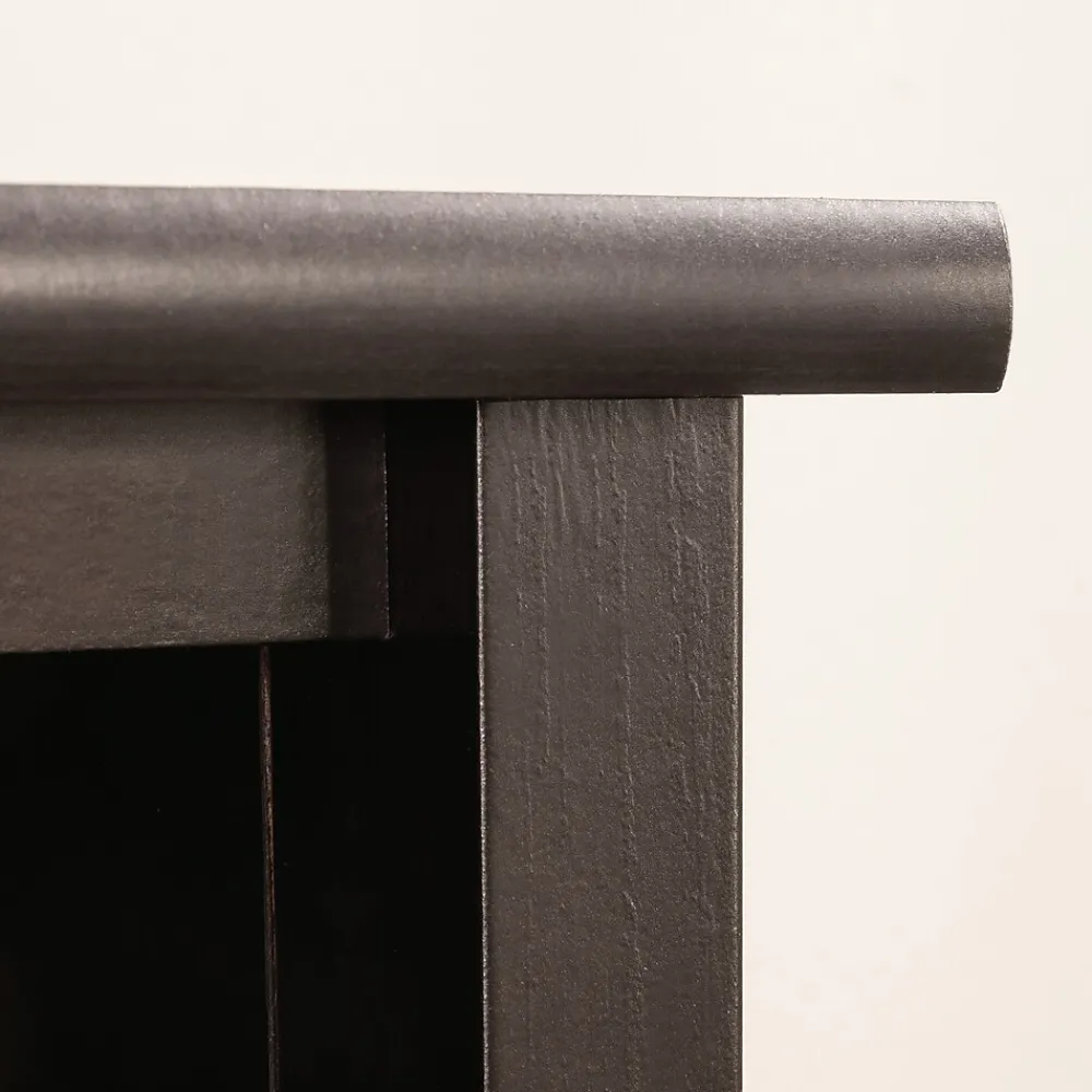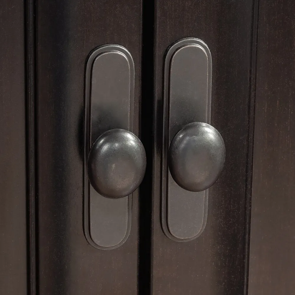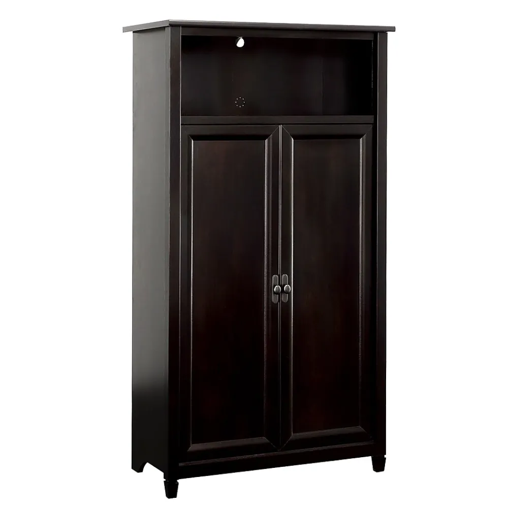 A tall, dark, and mysterious figure enters your home, and suddenly your life changes forever. Welcome the two-door storage cabinet, finished in the ebony brushed gloss of Estate Black. With subtle, golden, woodgrain highlights, this double door storage cabinet from the Edge Water collection will have the look of a priceless antique, but the function and value of a modern cabinet. Behind the two doors of this storage cabinet, your linens, tablecloths, seasonal decor, or movie collection can remain a secret. This storage cabinet with doors has four adjustable shelves creating versatile storage solutions for innovative organization. In addition to the mysterious, spacious storage inside, this storage cabinet with open shelf above has even more room for placing baskets and bins, or displaying photos, antiques, artwork and more. A remedy for modern household challenges can be found with this transitional style storage cabinet, featuring a timeless and elegant look with modern storage solutions.