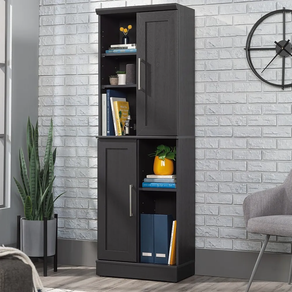 General storage woes have met their match; pantry items and bed linens – prepare to be organized. Introducing the modern storage cabinet from the HomePlus collection. This multipurpose 2-door storage cabinet has an easily configurable design which allows its doors to be positioned on the top, bottom, left or right. Adjustable base levelers give it added stability. With six adjustable shelves, this double-door storage cabinet will provide the ultimate versatility, from stacks of towels to baskets of toiletries, making it ideal for bathroom organization. Perfect for laundry room storage or a kitchen pantry extension, this storage cabinet with doors has pulled out all the stops. The enclosed back panel of this engineered wood storage cabinet provides cord access for easy and convenient cable management of electronic devices, making this storage cabinet ideal for home office use. Finished in the dark and stately Raven Oak, this storage cabinet will take your clutter to classy in no time at all.