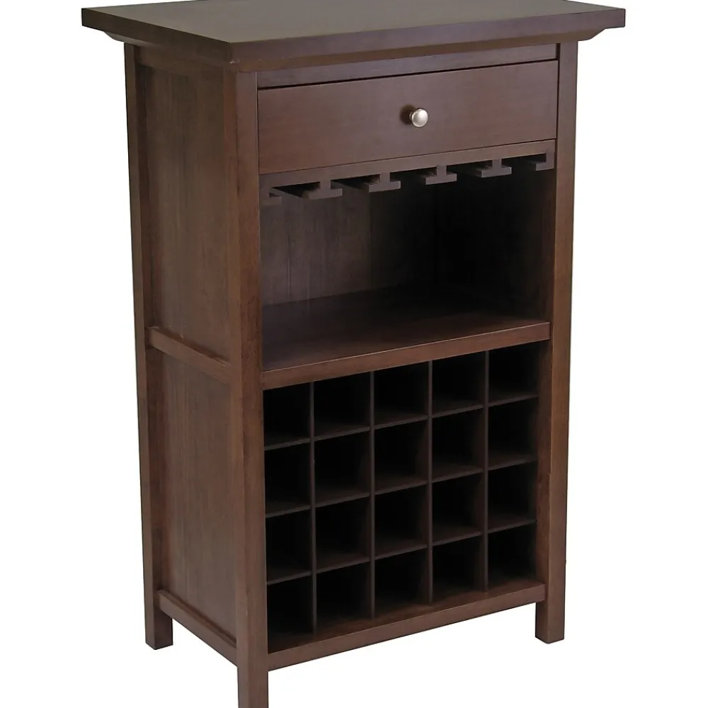 Winsome Wine cabinet has 20 bottles storage capacity and features racks to place goblets while drawers store wine accessories.Made of solid hardwood with walnut finish for durability and elegancy.
