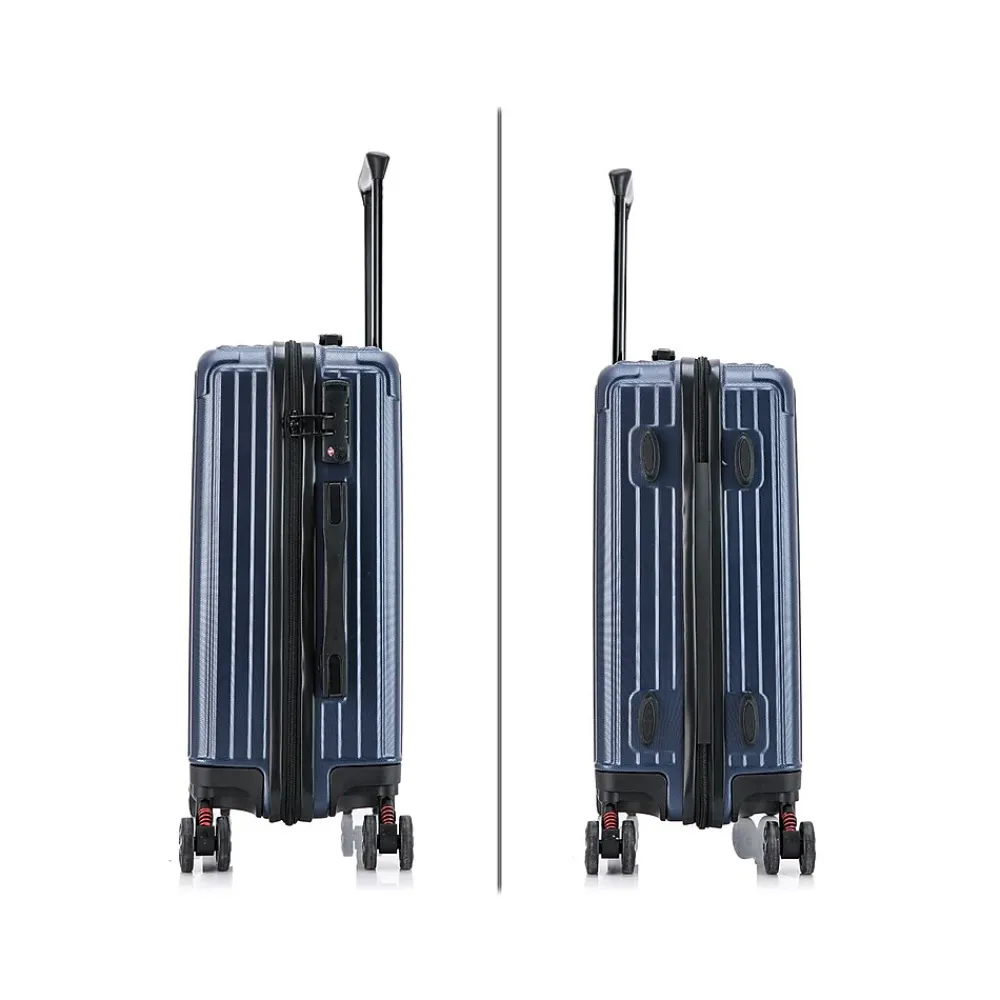 The hard-flex construction of this DUKAP STRATOS carry-on four-wheel spinner luggage offers maximum strength, durability, and a water-/scratch-resistant finish. It features a full interior fabric lining with a zipper compartment on one side and snap-on straps on the opposite side for easy packing.