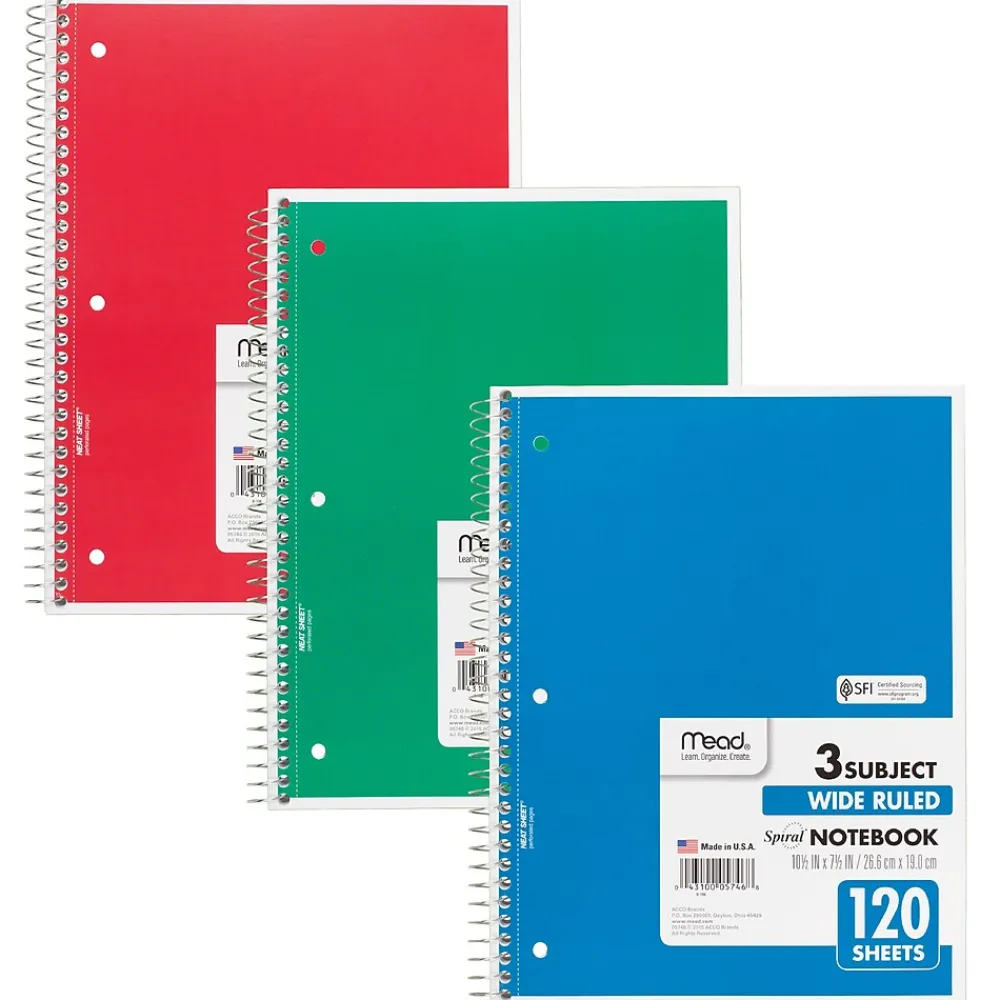 Get more usable space and stay organized with the 3 subject notebook that is wide ruled and available in a variety of colors. It’s versatile and perfect for a variety of uses including in-class notetaking and recording meeting notes. Pages are wide ruled and double-sided to provide plenty of notetaking space. Includes dividers to separate notebook into 3 subjects. Notebook spiral binding will not snag and resists uncoiling to keep your notes together. Notebook covers are coated for durability. White paper; 120 sheets, 10.5″ x 7.5″ page size. Assorted cover colors (no color choice). Pack of 6.