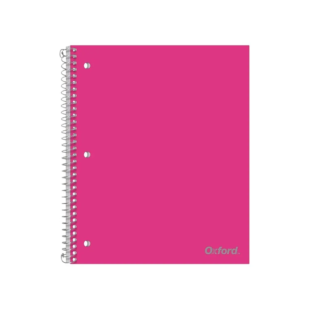 This Oxford one-subject poly notebook comes in bright colors with front pocket storage. The notebook is perforated, three-hole punched, and spiral-bound with a strong no-snag coil. Comes in assorted colors.