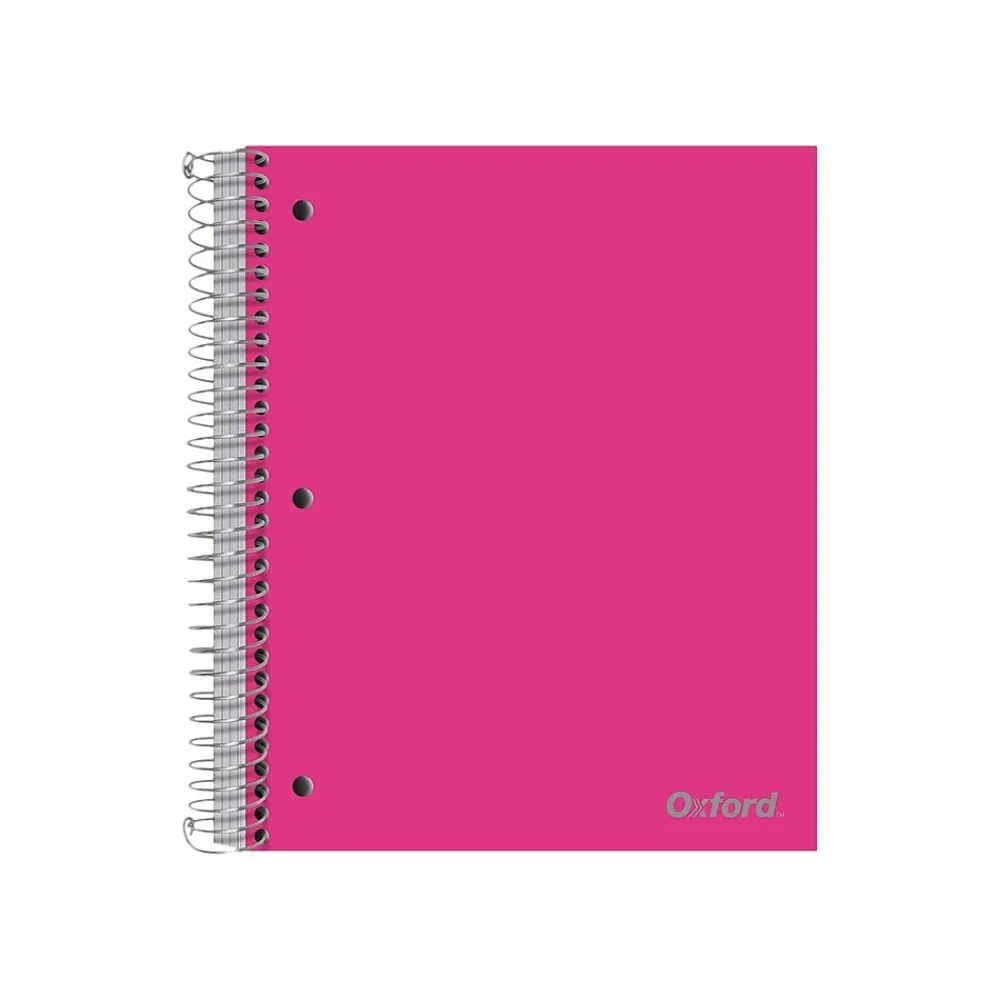 This Oxford five-subject poly notebook comes in bright colors and is three-hole punched to fit a standard binder. Includes five poly divider pockets and a strong no-snag coil. Comes in assorted colors.