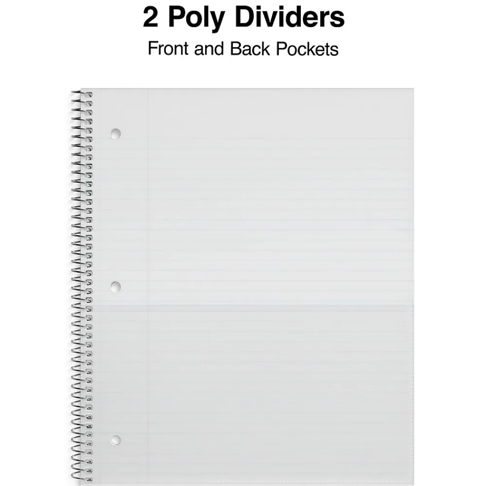 The Staples Accel two-subject notebook is perfect for note taking and writing. With tear resistant pocket dividers and a heavy-duty back cover, this notebook is very durable and built to last. It also comes in many unique colors to match your personal style and taste. With a super-strong coil to hold the pages, your notebook will not bend out of shape when placed in a backpack or drawer. The front cover features a poly material to protect your written work inside the notebook.