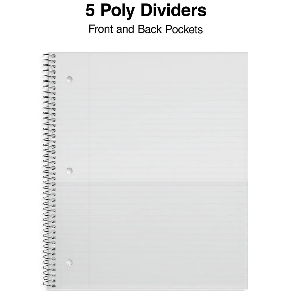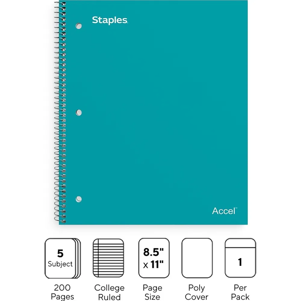 Subject Notebooks|Staples Premium Poly 5-Subject Notebook, 8.5″ x 11″, College Ruled, 200 Sheets, (TR58320) Teal