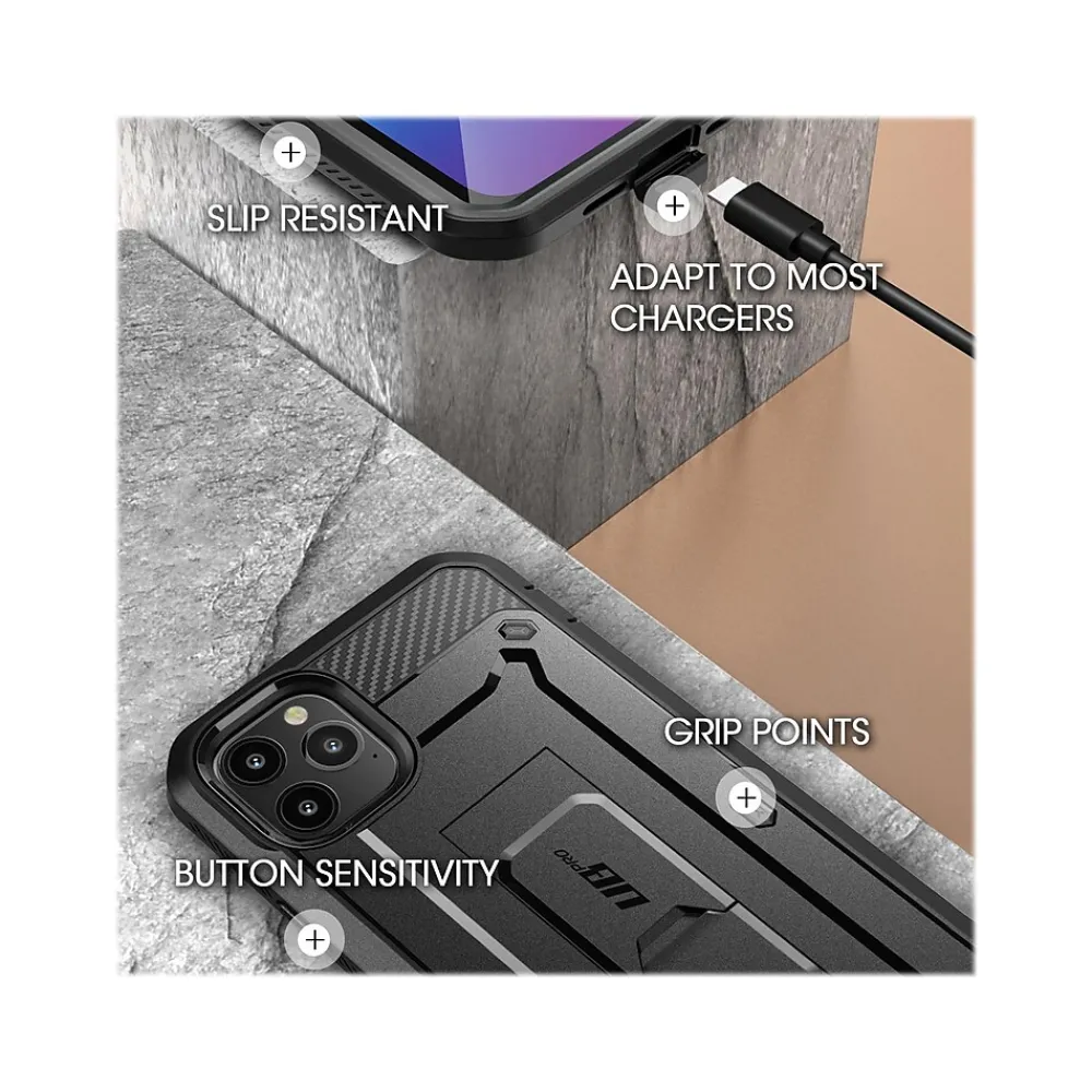 iPhone 12 Pro Unicorn Beetle Pro rugged case is a winner of CNET’s annual drop test with the highest total feet. A full-body design includes a built-in screen protector. Made of shock-absorbing TPU and unbending polycarbonate. MagSafe and wireless charge compatible, it includes a rotating belt clip holster.