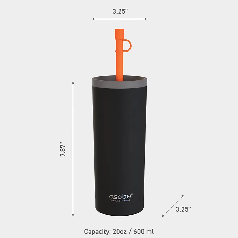 The Black ASOBU 20 Oz. Super Sippy Insulated Coffee Tumbler lives up to its name! The body is a double wall, insulated cup, which means your beverage stays cold or hot for hours. The 2-piece straw has a bendable silicone top on the outside, while the rest of the straw is made of Tritan to ensure it performs effectively day after day. The wide screw-off lid makes it easy to fill with liquid and ice cubes.