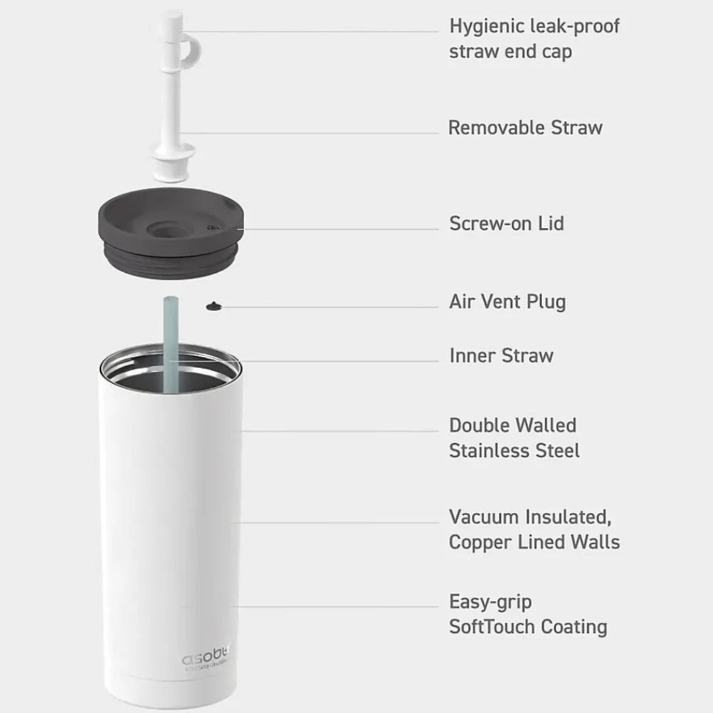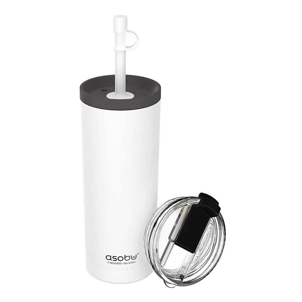 The White ASOBU 20 Oz. Super Sippy Insulated Coffee Tumbler lives up to its name! The body is a double wall, insulated cup, which means your beverage stays cold or hot for hours. The 2-piece straw has a bendable silicone top on the outside, while the rest of the straw is made of Tritan to ensure it performs effectively day after day. The wide screw-off lid makes it easy to fill with liquid and ice cubes.