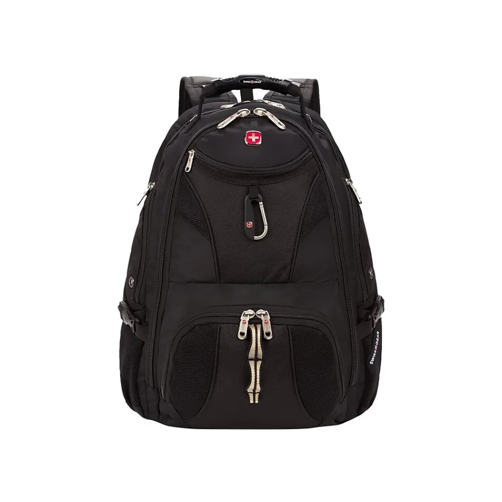 Pack all of your gear and then some in this extra-roomy, full-featured laptop backpack. The Swissgear 1900 ScanSmart Laptop Backpack is made from durable 1200D ballistic polyester fabric and is equipped with a large opening main compartment with rugged oversize zippers, adjustable side compression straps, a heavily padded back panel with Airflow ventilation technology, padded contour shaped shoulder straps with mesh fabric and built-in suspension as well as ScanSmart lay-flat technology for the ultimate in laptop-in-case TSA scanning for most portable computers up to 17″ in size. Other features built into the case include a dedicated floating TabletSafe tablet pocket, an accordion file holder, an organizer compartment, multiple internal accessory pockets, side accessory and water bottle pockets, a padded media pocket, a molded top handle, a webbing daisy chain and carabiner to attach gear to when you’re on the go, a front quick-access pocket and reflective accent material built into the shoulder straps for added safety when out at night.