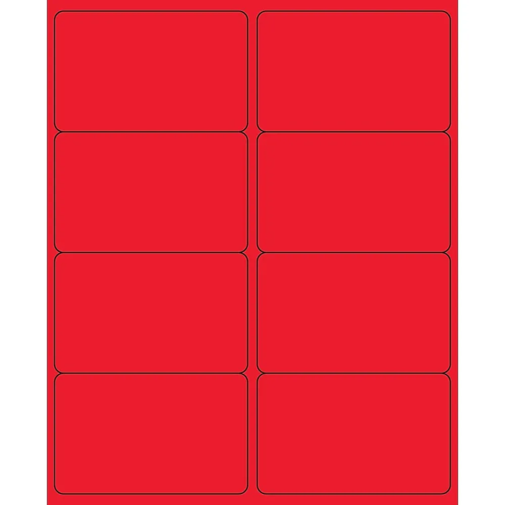 4″ x 2 1/2″ Fluorescent Red Rectangle Laser Labels. Use to create your own product or mailing labels. Labels work with both Laser and ink jet printers. Permanent adhesive. Labels stick to a variety of smooth surfaces including paper, corrugated, plastic, wood, glass and metal.