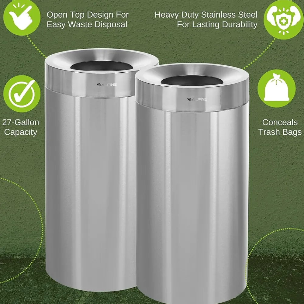 - Stainless steel bins can accommodate up to 27 gallons of waste each