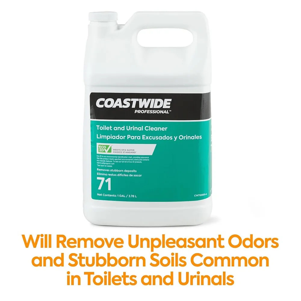 Coastwide Professional 71 toilet and urinal cleaner will remove unpleasant odors while removing to toughest of soap scum, urine deposits, and other stubborn soils common in toilets and urinals. It is safe to use on porcelain, ceramic, porcelain enamel, and stainless steel. Unlike harsh acid cleaners, it will not etch or damage toilet, urinal, or adjacent surfaces.