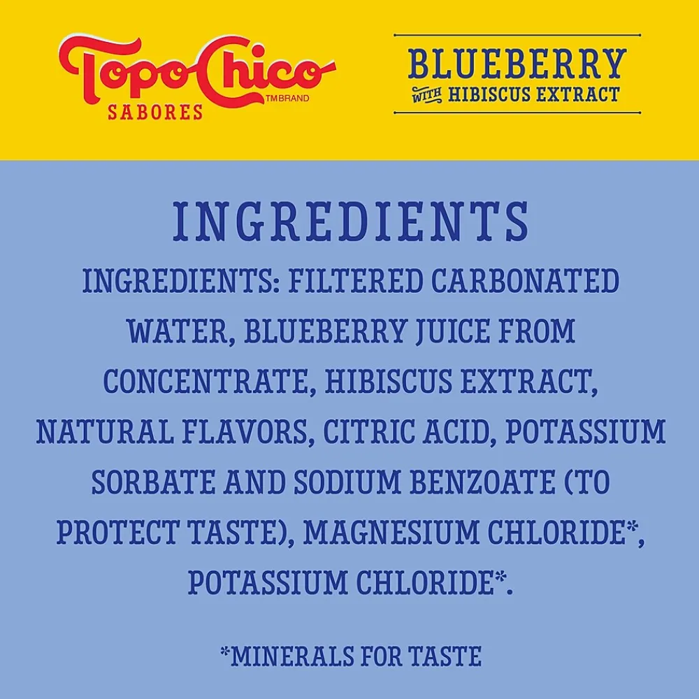 Topo Chico Sabores Blueberry Hibiscus Sparkling Water has real fruitjJuice with a Hint of Herbal Extracts, paired with the signature minerality & exceptional effervescence for an elevated taste on a healthier indulgence.Enjoy Topo Chico Sabores on its own, as a cocktail mixer, or pair it with your favorite dishes. Elevate your dining and hydration experience with every bubbly sip!
