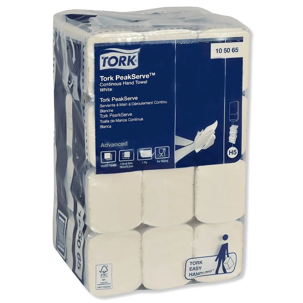 Tork® PeakServe® Continuous™ Hand Towels means fewer washroom delays – gets guests in and out faster. Avoid run outs with 250% more hand towels and lower consumption thanks to one-at-a-time dispensing. Faster dispensing serves guests in 3 seconds – quicker than jet air drying time. Taking a towel is always smooth and easy with our patented continuous towel system. More flexibility means more time to clean. Top it up when it suits you with up to 600 more guests served between refills. Double the towels you carry as they’re compressed by 50%. Cut refill time in half with over 2000 towels per dispenser. Poly bag wrapped.