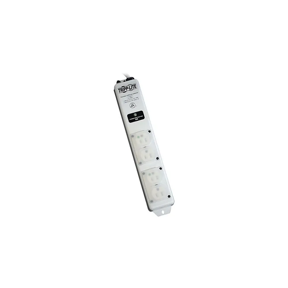 The Tripp Lite SPS406HGULTRA white 6′ 4-outlet power strip with surge protection, is perfect for use in all patient-care vicinities, therapy rooms, imaging environments, laboratories and administrative areas. It has four NEMA 5-15R-HG ports for connectivity. It requires 120 VAC at 50/60 Hz, 15 A input power. It has energy rating of 1410 J and maximum surge rating of 60000 A. Rugged all-metal housing ensures long-life usage in demanding environments. LED indicator ensures power presence and surge-protection.