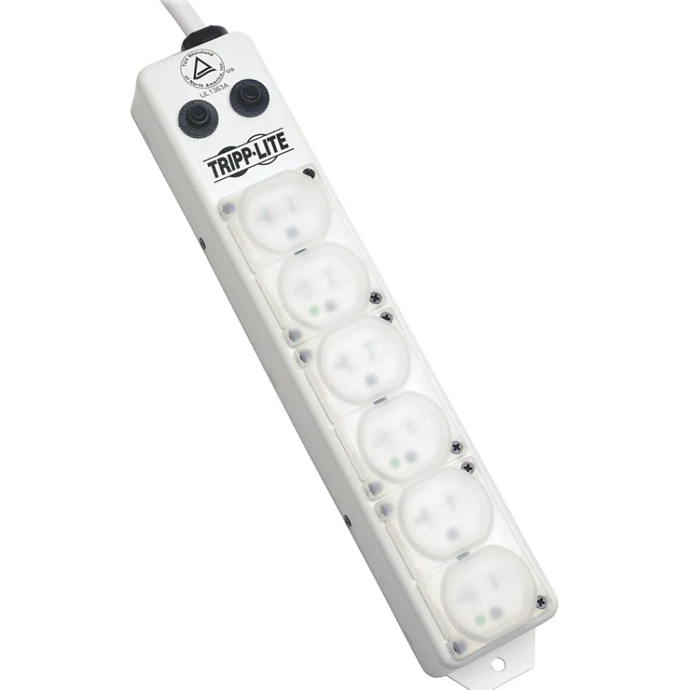 This Tripp Lite medical-grade power strip is suitable for providing power in operating rooms, administrative areas, patient-care areas, therapy rooms and imaging environments. The switchless design of the power strip helps prevent accidental shutoffs, and the two resettable 20 A built-in circuit breakers safeguard against circuit overloads. A locking safety cover keeps debris away from the unused outlets. The 120 V power strip measuring 13 3/4″ x 2 1/2″ x 1 1/2″, has a rugged metal housing to withstand years of use.