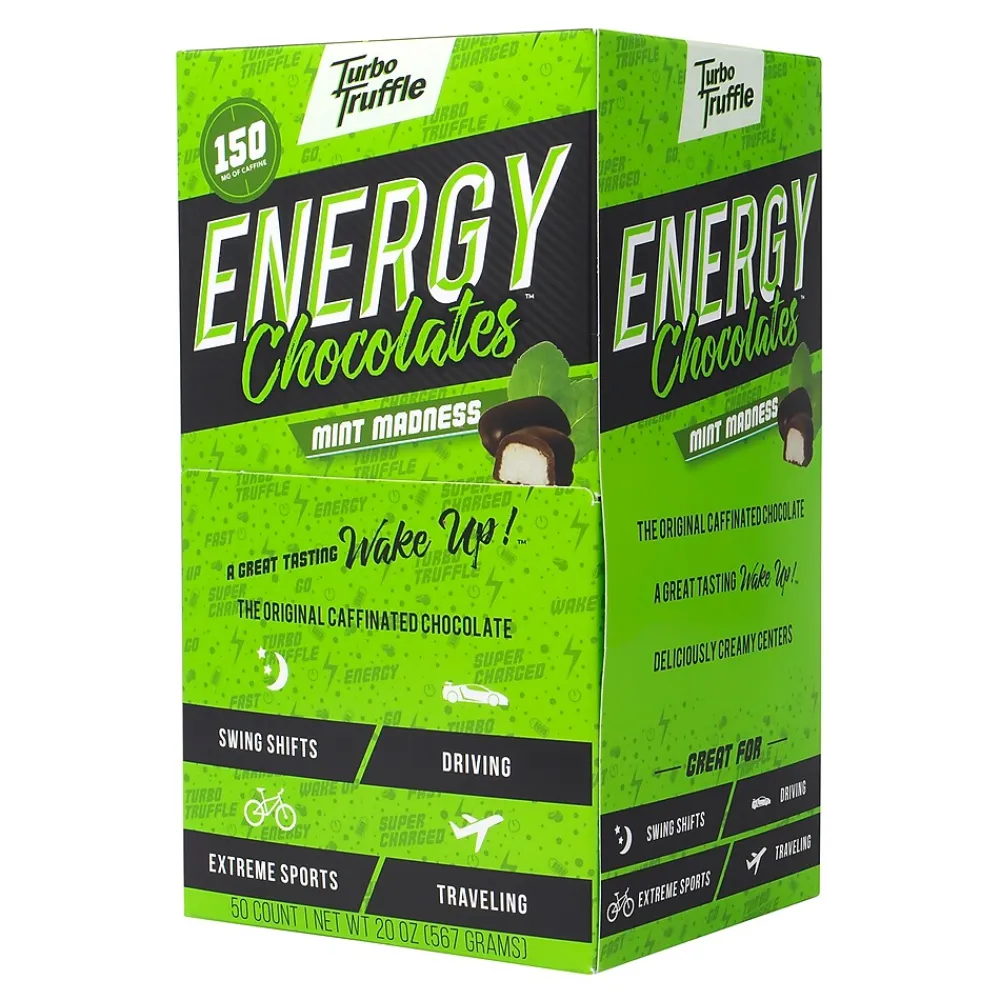 - A 50-Piece box of Turbo Truffles Energy Chocolate Mint Madness flavor