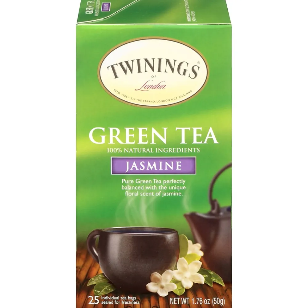 Indulge in refreshing, flavorful servings of pure green tea. Made from 100-percent natural ingredients and infused with real jasmine flowers, it offers a unique floral taste and aroma. Each box contains 25 1.76-ounce bags of Twinings green tea to provide quick servings for groups or small parties.