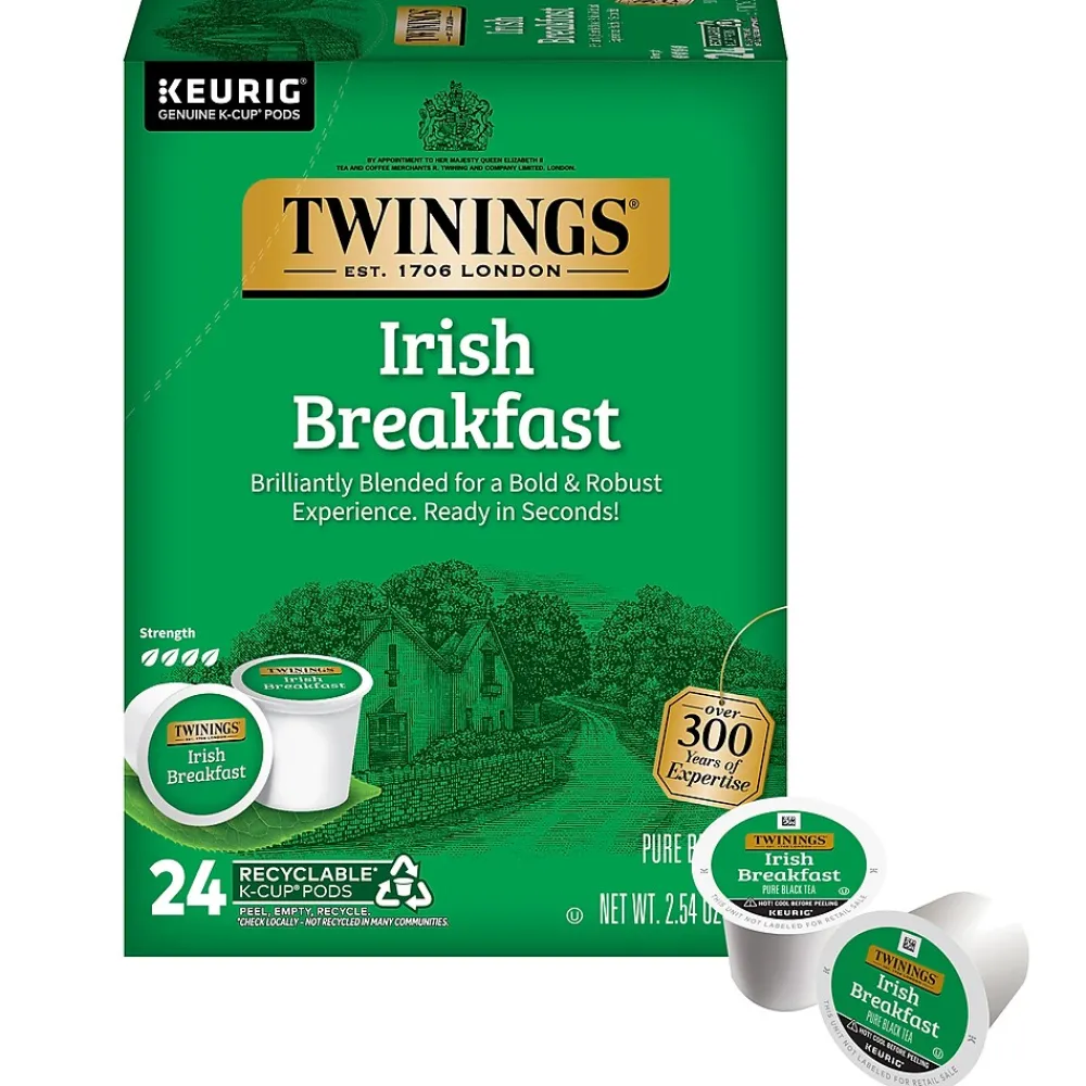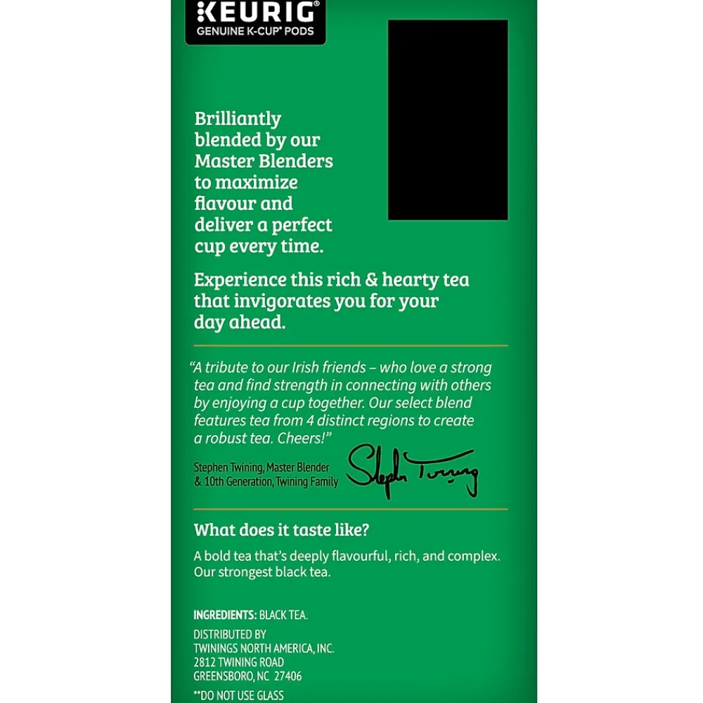 Our Irish Breakfast tea pays tribute to the Irish, who are well-known for their love of strong teas. This blend combines teas carefully selected from four distinct regions to give it added body, flavor and strength. The bold taste originates from teas grown in the tropical climate of Assam and the rich, amber color from teas grown in the fertile terra Rossa soil of Kenya. The hardiness from these regions is complemented by the softer and more subtle teas from Indonesia and China to yield a full-bodied tea with a smooth finish.
