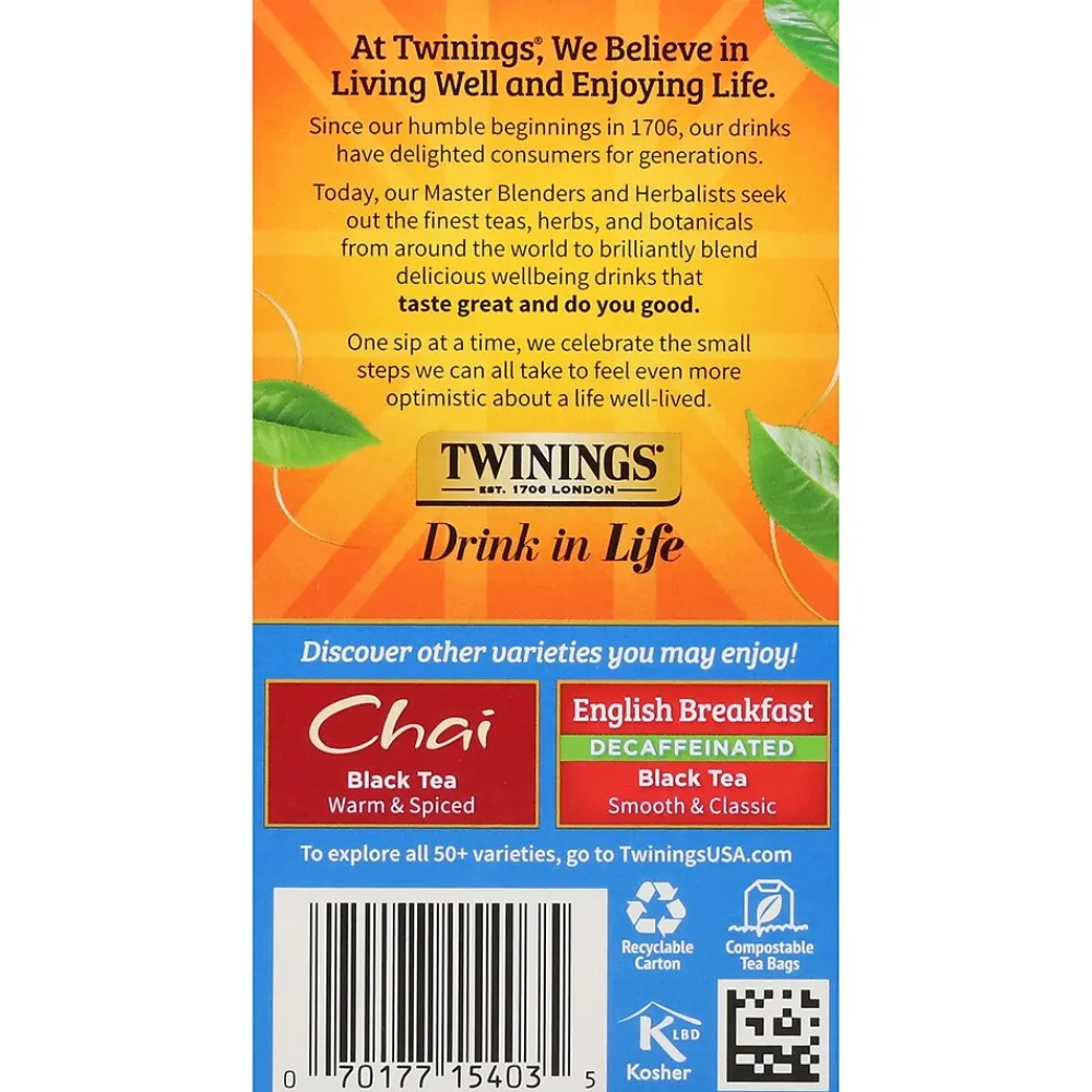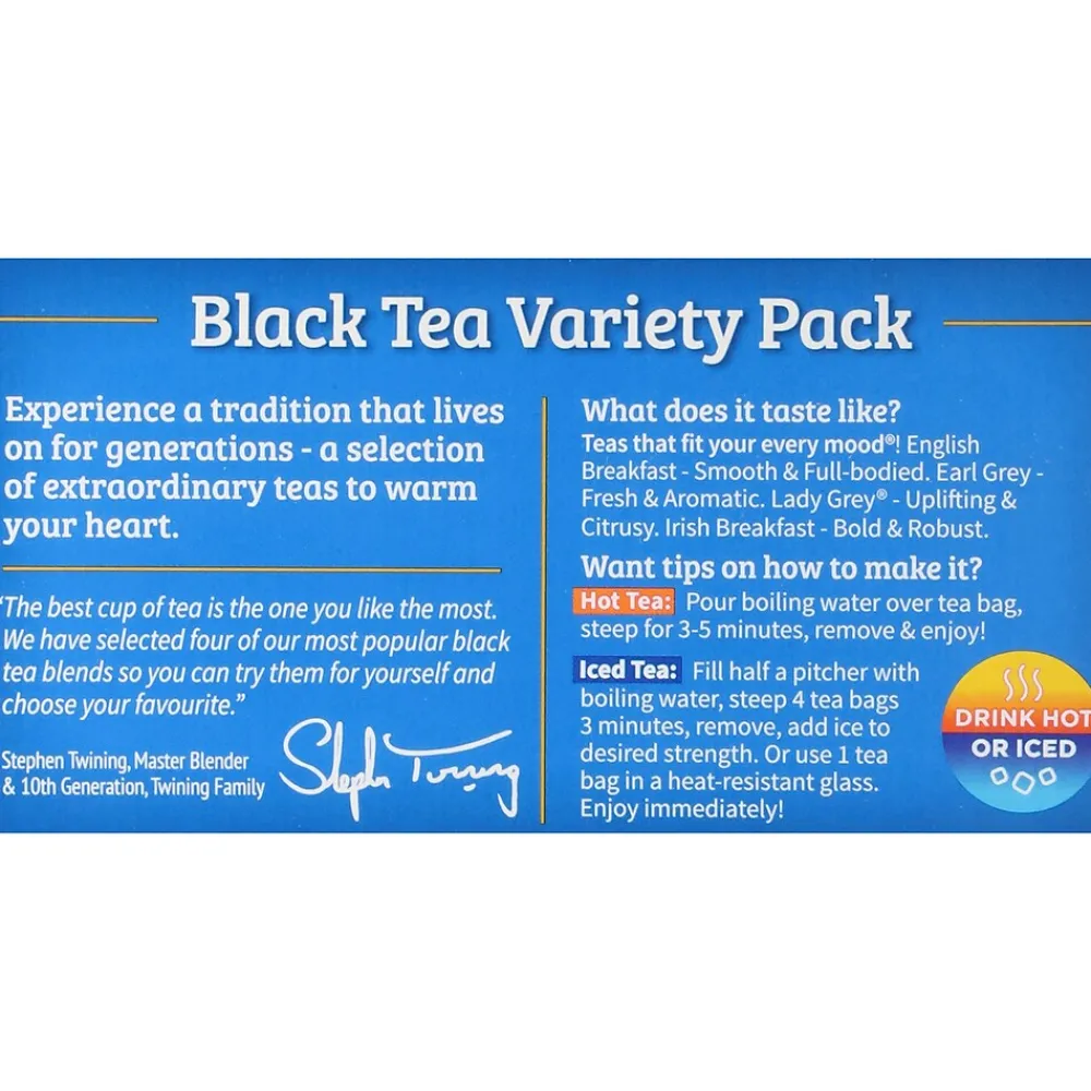 Enjoy this assortment of delicious classic black tea offerings from the master blenders of Twinings. At Twinings, they believe there is possibility in every moment to live well and enjoy life, from the way people move to how they connect to what they eat and drink. The brand is committed to providing a wide range of hot and cold beverages specially crafted to suit your unique needs and help you thrive. Each day is an opportunity to be just a little better than the day before, and Twinings is committed to the journey, one sip at a time.