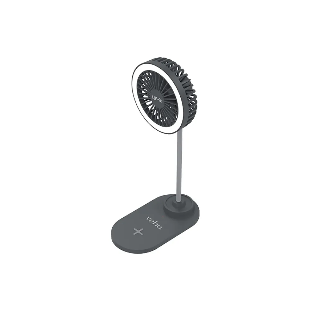 The Veho UF-2 is a multipurpose three-in-one desktop charging stand equipped with a wireless 15W smartphone fast charger, a three-speed fan, and a bright LED ring light.