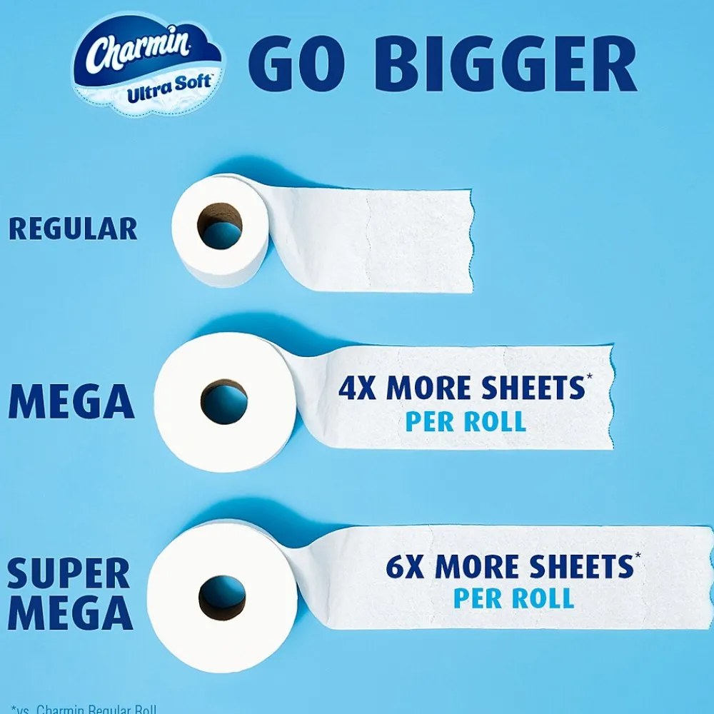 - 1 Super Mega Roll = 6 Regular Rolls* *based on number of sheets in Charmin Regular Roll bath tissue