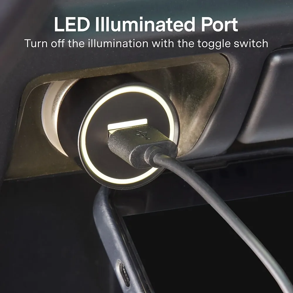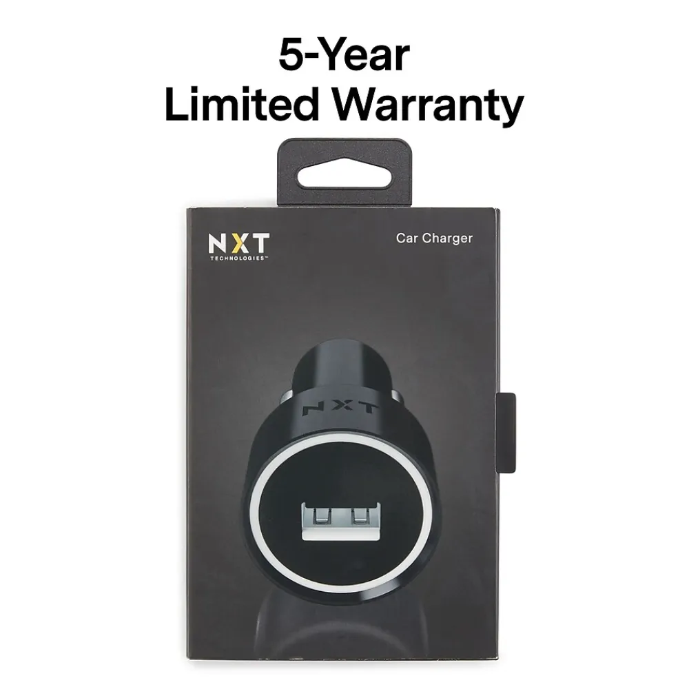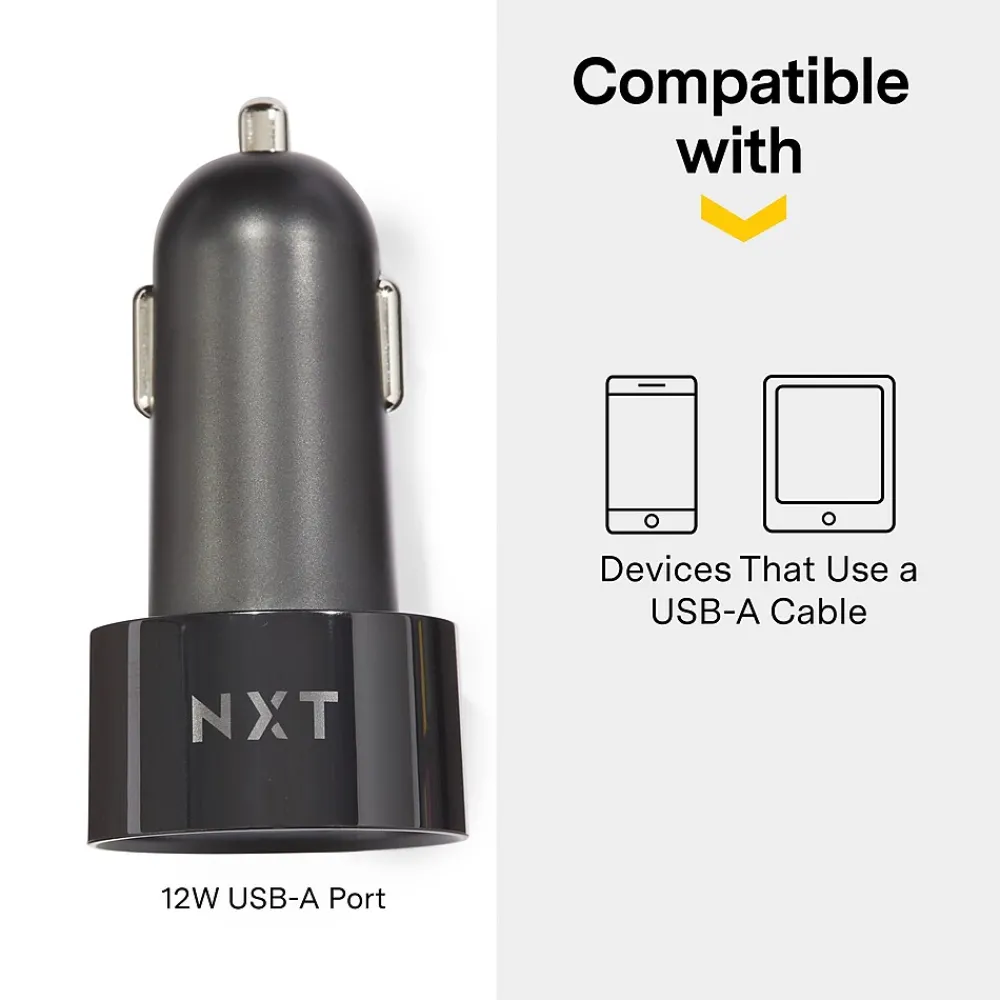 Connect tablets, smartphones, and other devices to this car charger for 12 watts of rapid charging. An illuminated port on this NXT Technologies™ one-port black car charger makes it easy to connect in the dark, while the compact design takes up little space.