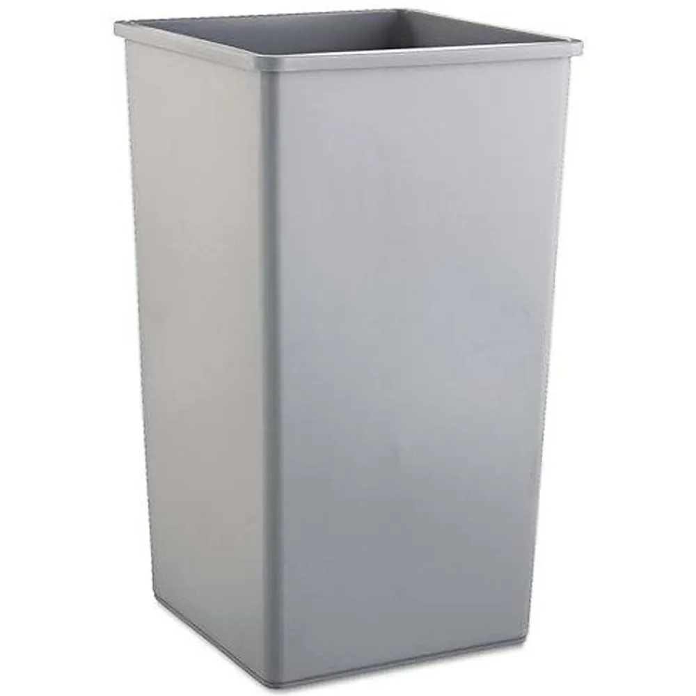 Rubbermaid 50 gal Untouchable square waste container in gray color is durable and crack resistant even under tough indoor/outdoor conditions. Container promotes recycling improving productivity.