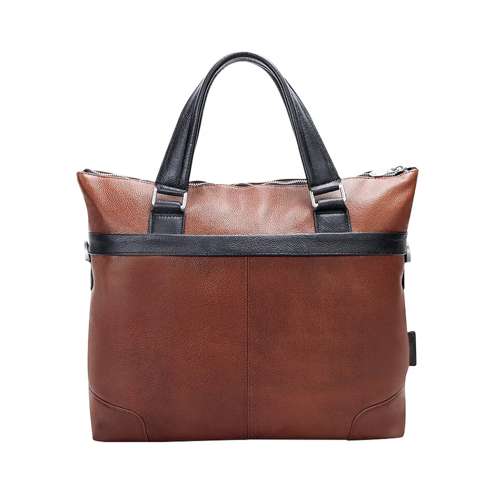 Carry all your important devices in this McKleinUSA EASTWARD U Series leather laptop and tablet briefcase designed with elegant contrasting leather accents. Conveniently access your essential items safely in its hidden full-length front zipper pocket. Its fully lined interior is accented with leather trim and silver hardware securing your items with lockable zipper. Well-designed full-length interior zipper pocket and business accessory organizer help make your day go smoothly. Exterior back zipper pocket for easy access to your most needed items (cellphones, keys, and more). Transport in comfort with the removable non-slip contour-padded shoulder strap, and set it down with confidence on five protective metal feet.