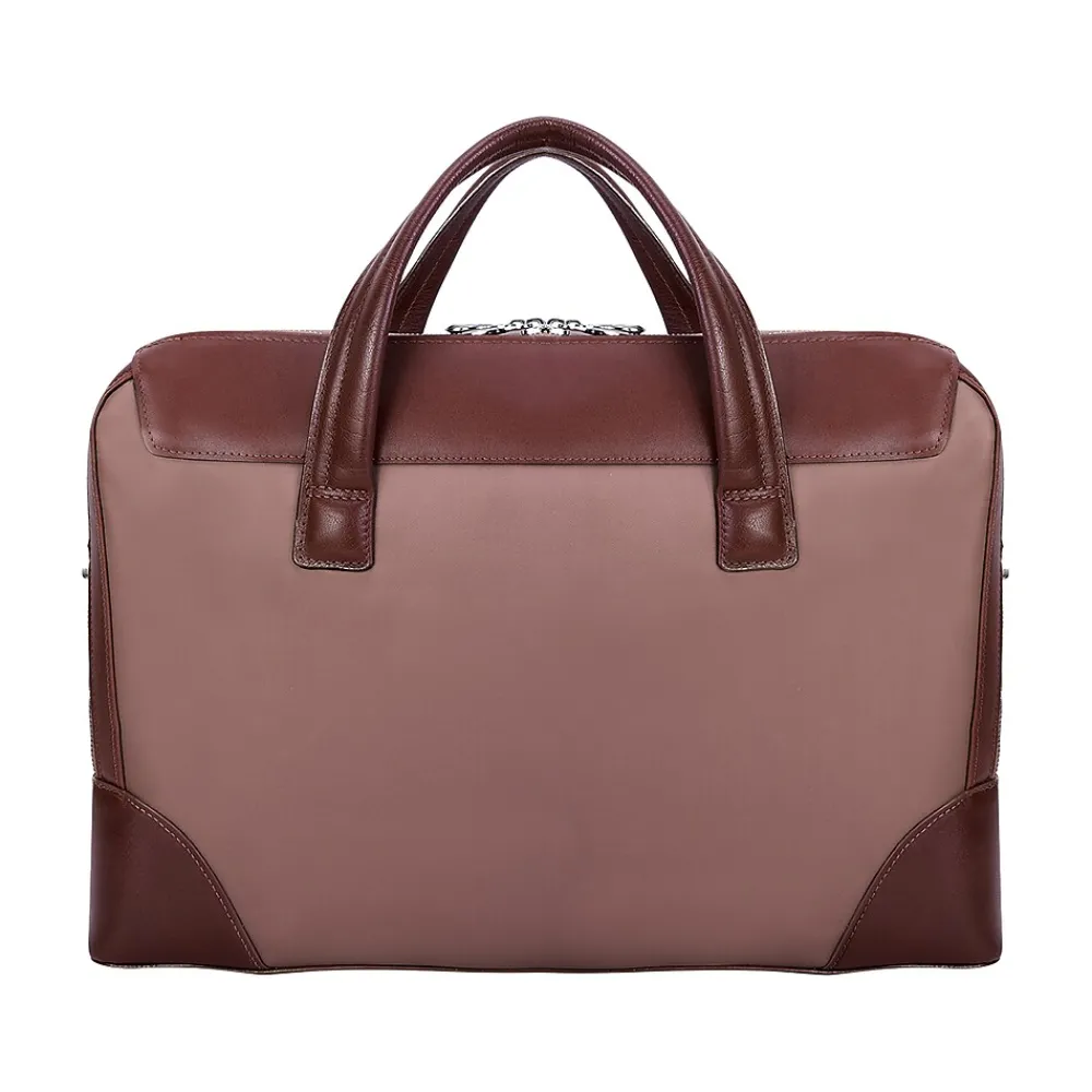 - Khaki-colored briefcase with brown inserts made of nano tech-light nylon with a leather trim