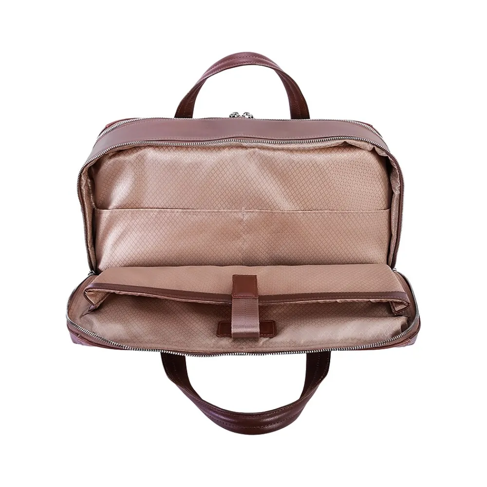 This structured nylon briefcase with a leather handle has a fully lined interior with leather accents. Its front compartment features dual tablet pockets with an organizer for business cards, pens, and accessories. The spacious back compartment features a padded laptop compartment.