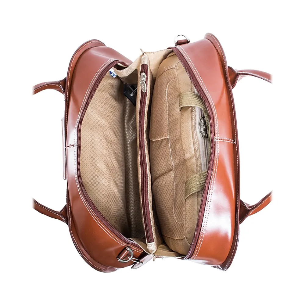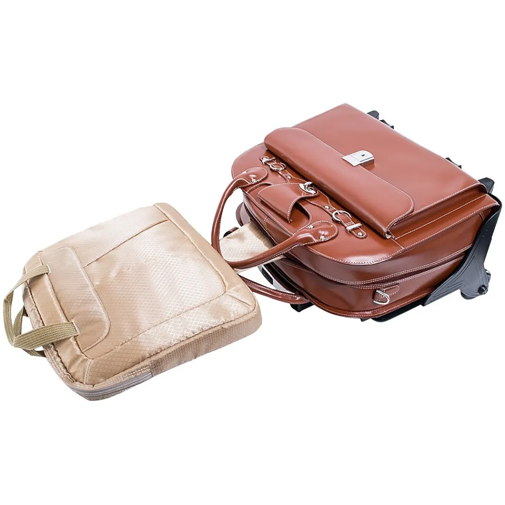 The ROSEVILLE W Series by McKleinUSA is leather wheeled ladies laptop briefcase that has patented 2-in-1 removable wheel and handle system. Fly-through checkpoint-friendly design with a secure, removable padded sleeve that fits laptops up to 15″. Flapover front pocket with a key lock for added security. Small front pocket secured by flap with turn lock. Main compartment divided by a secure zipper pocket. Interior organizer section for business cards, pens, keys, cell phones, and notepads. Interior zipper pocket.