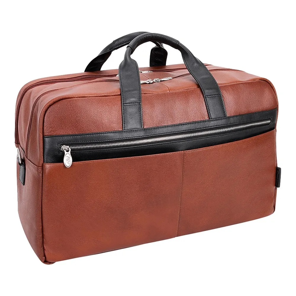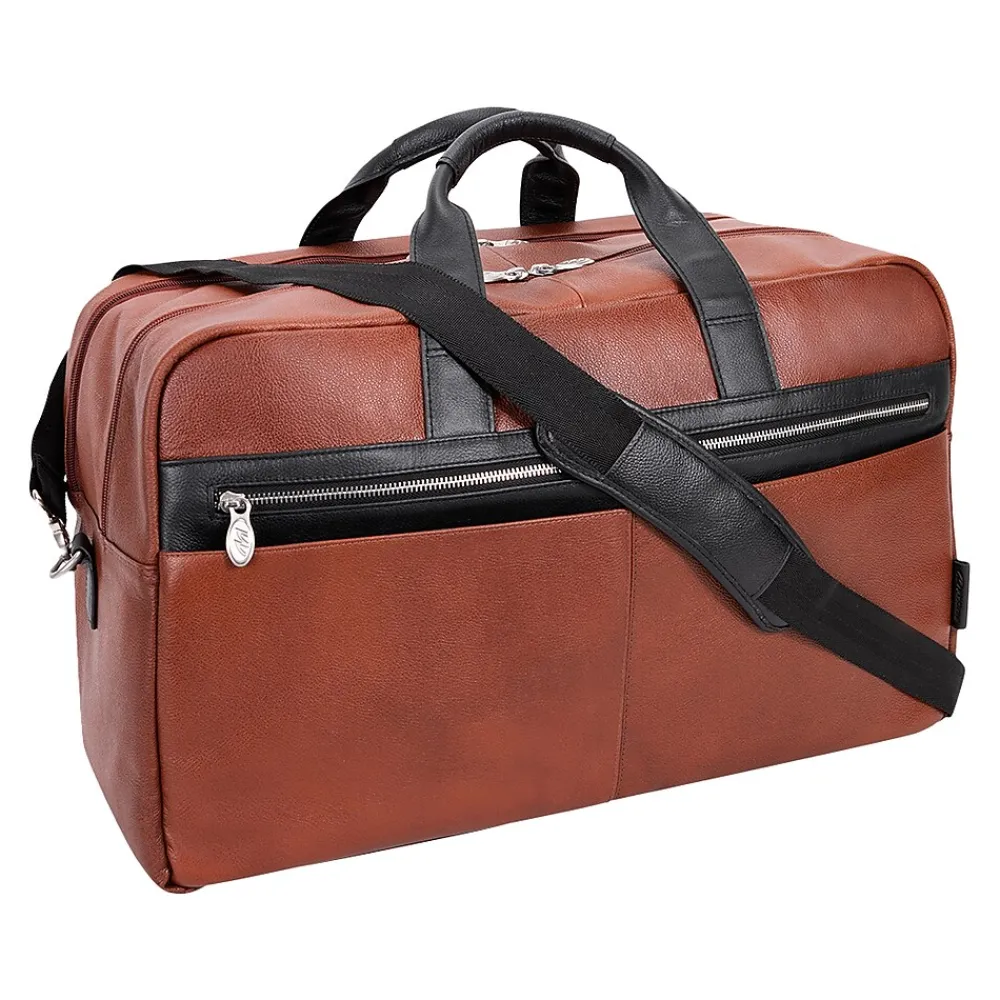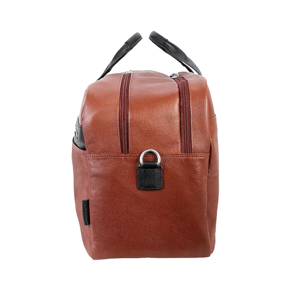 Amazingly spacious McKleinUSA U Series WELLINGTON dual-compartment carry-on duffle with elegant contrasting leather accents makes packing for important trips simple. Cellphones, keys, and other such items can be stored for easy access in the front zipper pocket with accessory organizer. Other necessary items can be stored in the front dual slip pockets. The fully lined interior with leather trim and silver hardware will keep all your valuable necessities stored safe with double anti-theft locking loop metal zippers. Clothes, files, papers, etc. can all be stored in the main compartment with enough room for a week. Keep your toiletries in the elastic pockets for simple storage. The back compartment can safely store your laptop and tablet in the secured built-in padded laptop sleeve and tablet pocket. Attach the included removable non-slip contour-padded shoulder strap, and sling the bag onto your shoulder. Unzip the back pocket to attach to any rolling case for comfortable transport, and set it down with confidence on five protective rubber feet.