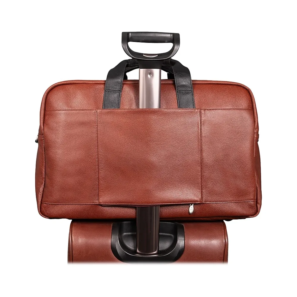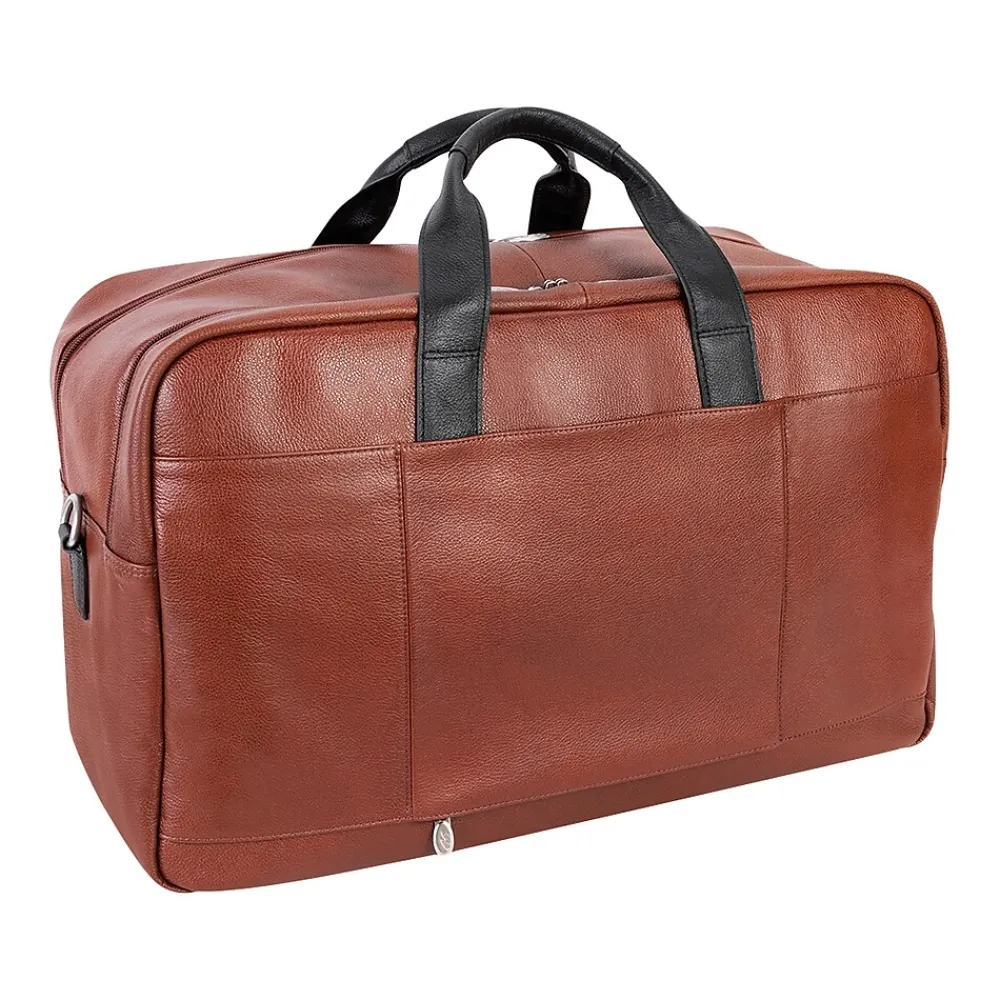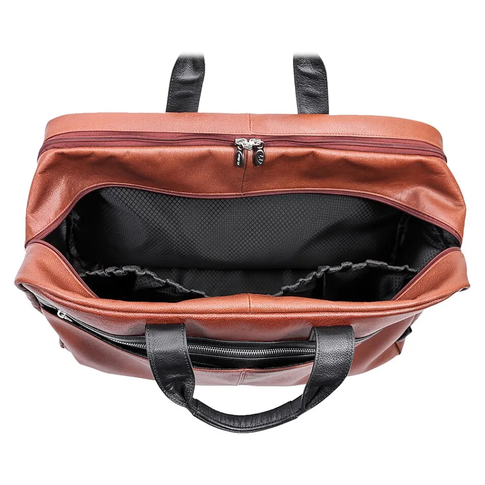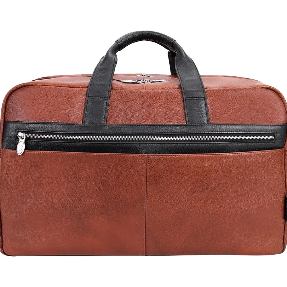Amazingly spacious McKleinUSA U Series WELLINGTON dual-compartment carry-on duffle with elegant contrasting leather accents makes packing for important trips simple. Cellphones, keys, and other such items can be stored for easy access in the front zipper pocket with accessory organizer. Other necessary items can be stored in the front dual slip pockets. The fully lined interior with leather trim and silver hardware will keep all your valuable necessities stored safe with double anti-theft locking loop metal zippers. Clothes, files, papers, etc. can all be stored in the main compartment with enough room for a week. Keep your toiletries in the elastic pockets for simple storage. The back compartment can safely store your laptop and tablet in the secured built-in padded laptop sleeve and tablet pocket. Attach the included removable non-slip contour-padded shoulder strap, and sling the bag onto your shoulder. Unzip the back pocket to attach to any rolling case for comfortable transport, and set it down with confidence on five protective rubber feet.
