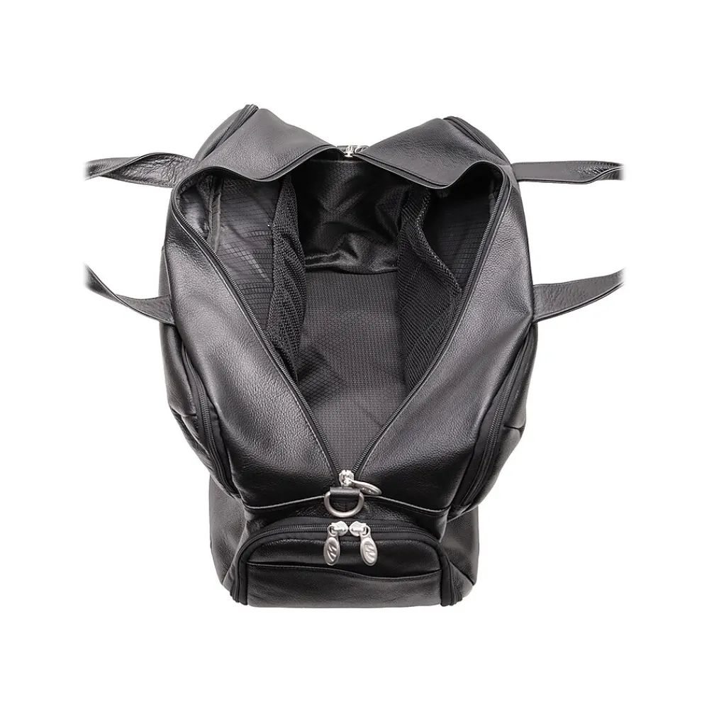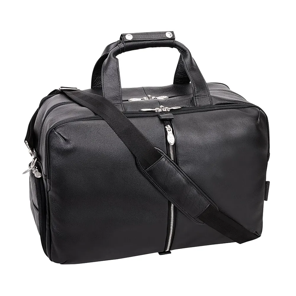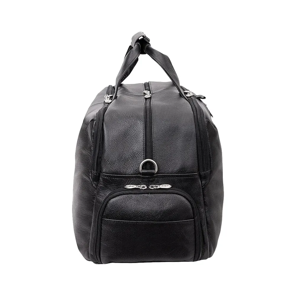 A true modern all-purpose McKleinUSA U Series AVONDALE 22″ travel duffel bag is capable of carrying everything in its spacious compartments. Carrying in comfort and stability with the conveniently designed double snap handle wrap. Easy access to travel essentials through the full-length front vertical zipper compartment. The bag is fully lined with leather accents and silver hardware to make storage easy and pleasant. You can keep your cell phone and keys in the front compartment’s business accessory organizer. The middle compartment is amazingly roomy with front and back elastic pockets to store your toiletries and shoes. The back compartment features a 17″ laptop/tablet pocket and a file divider to keep all your important devices and documents secure. Carry in comfort with the full-length, adjustable, non-slip, detachable leather padded shoulder strap. Set it down with confidence on five protective feet. Convenient side shoe pocket for extra kicks and comfort.