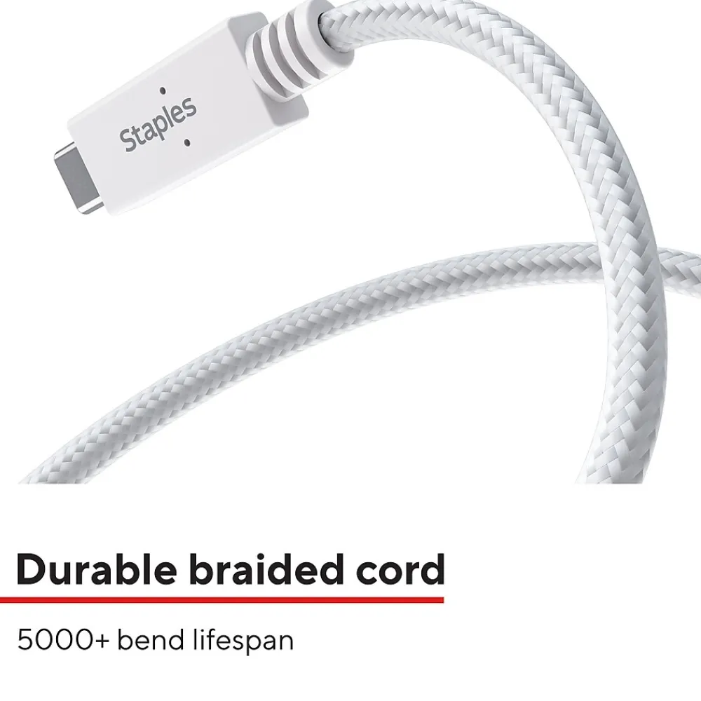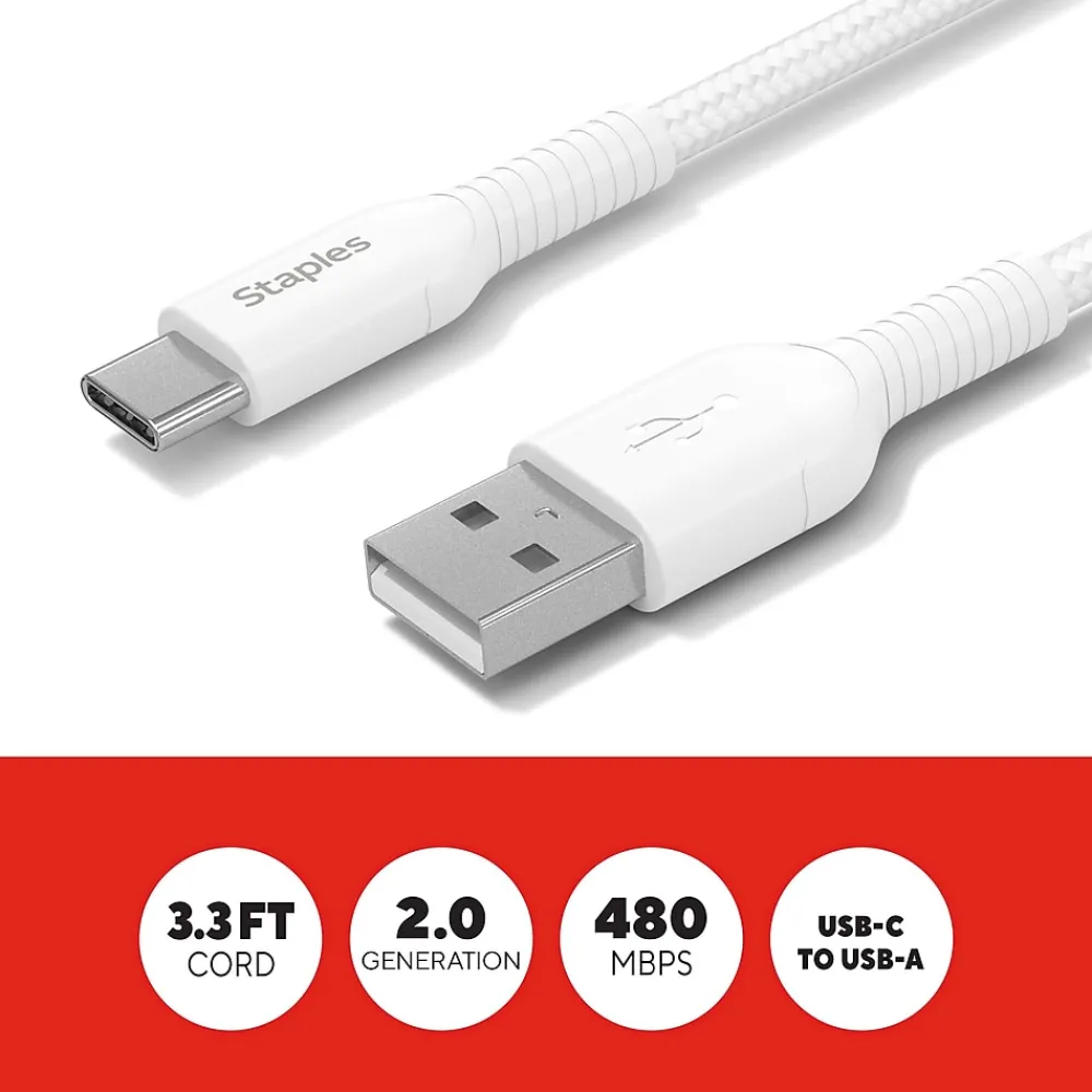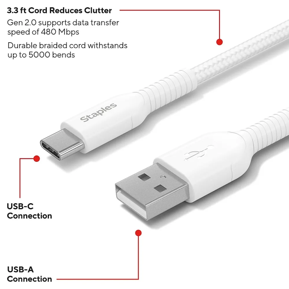 Power your smartphones or tablets with this StaplesĀ® USB-C to USB-A Braided Cable. The unique braided design provides extra durability, prevents tangles and has been tested to withstand up to five-thousand bends. A 3.3ft (1m) cable length is compact enough to prevent messy cords and is easy to take with you on the go.