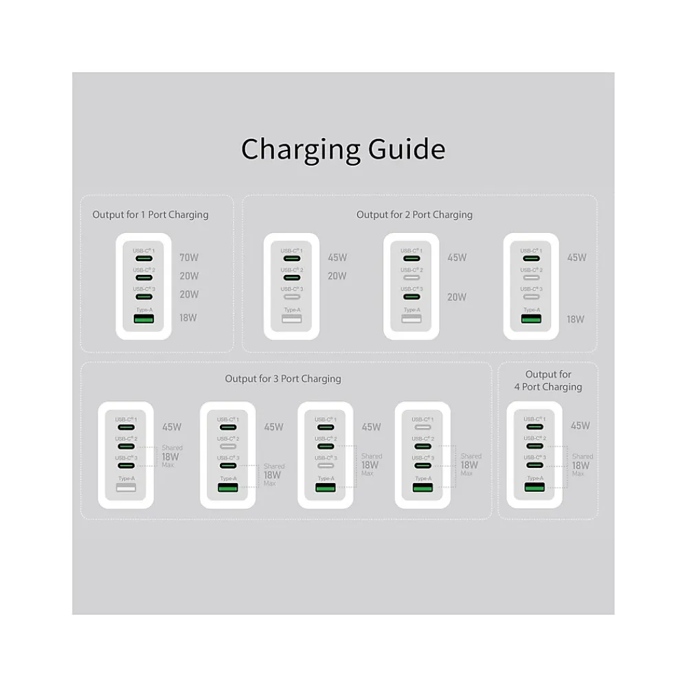 - This four-port charger can effortlessly charge four devices simultaneously with up to 70W of power