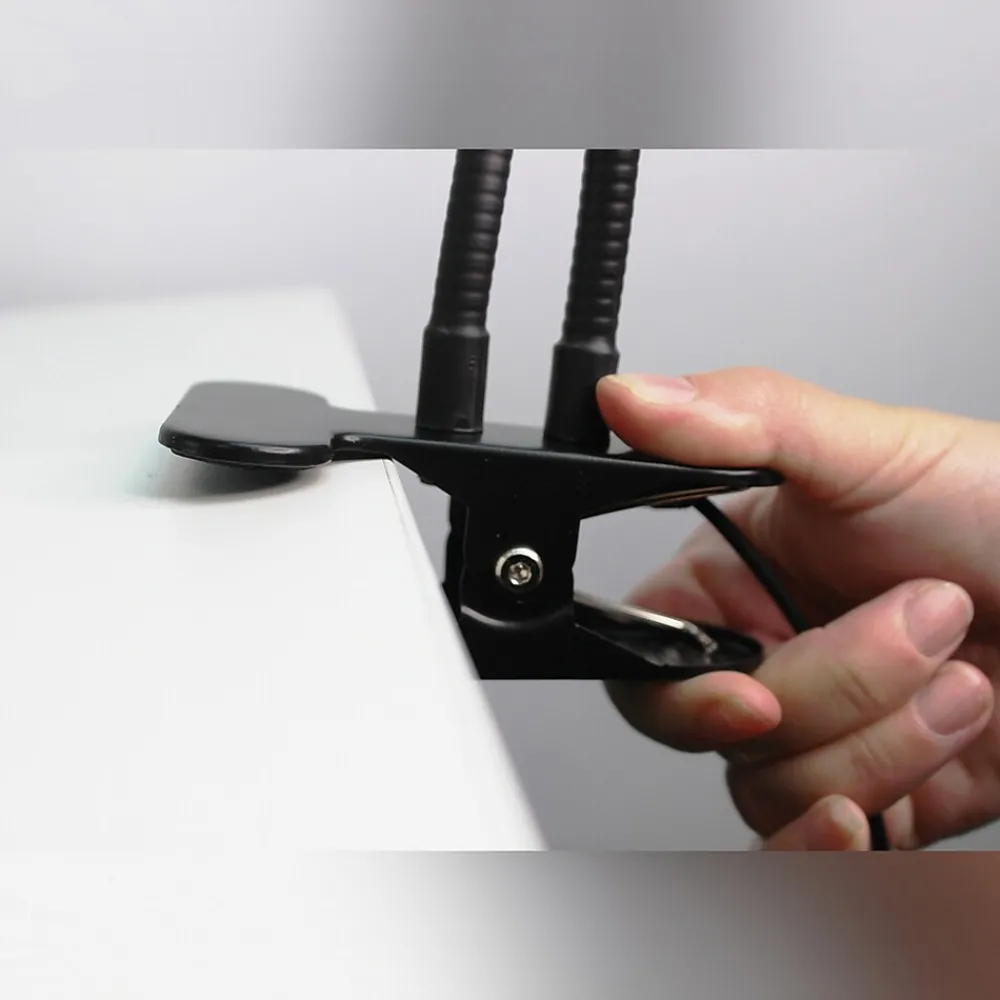 - Includes LED lamp and desk clamp