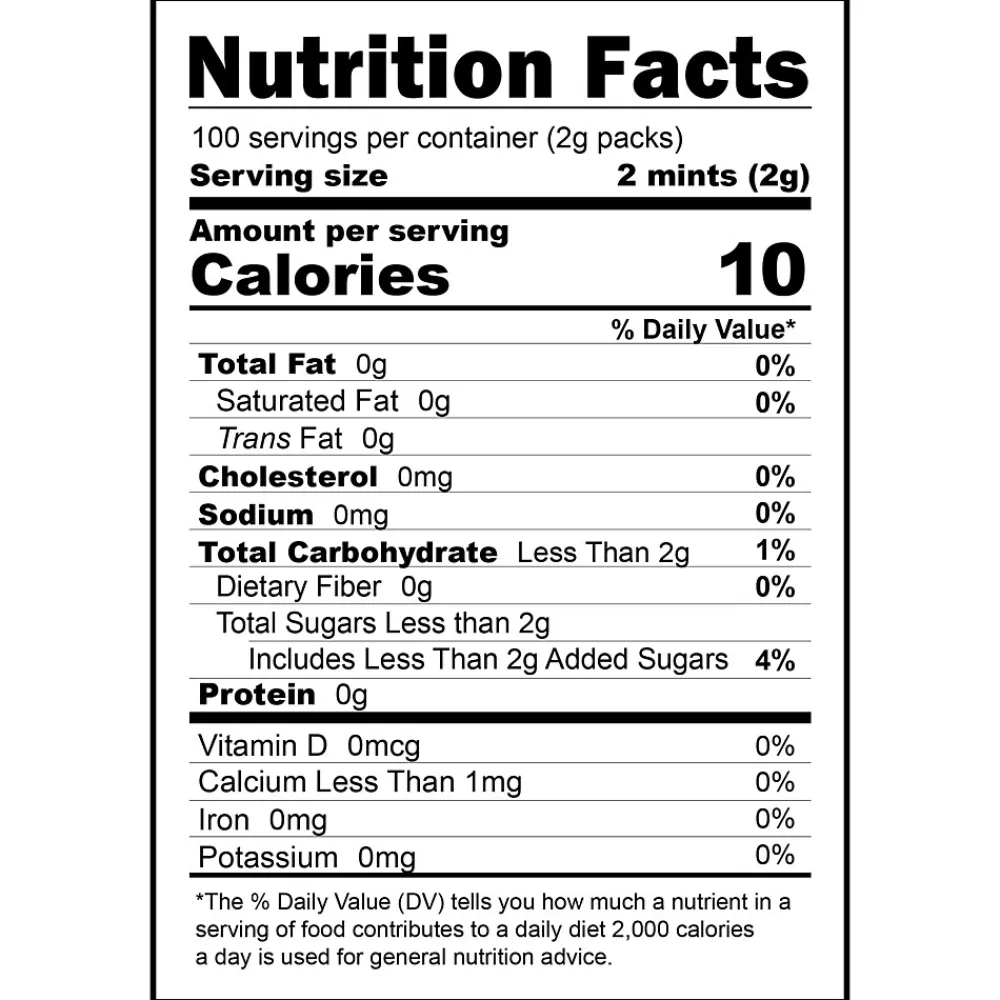- Box contains 100 individually wrapped mint packs (two mints per pack)