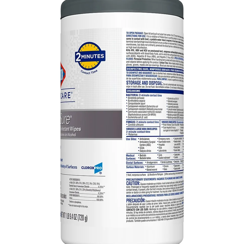 Clorox Healthcare VersaSure Cleaner Disinfectant Wipes kill over 40 pathogens* quickly on a broad range of surfaces. These strong and durable clothlike wipes are your alcohol free solution to cleaning and disinfecting. VersaSure wipes are EPA registered to kill pathogens on hard surfaces in as fast as 30 seconds for most bacteria and viruses, including mumps, measles, MRSA and tuberculosis. These one step disinfecting wipes meet EPA efficacy testing requirements for hospital disinfection, making them great for daily use in your healthcare facility. Designed for patient and staff comfort, the alcohol free quat formula is made with no harsh chemical odors, fumes or added fragrances. The non woven wipe does not leave lint on surfaces, and the larger wipe covers more surface area with less effort. Intended for use in healthcare settings.
