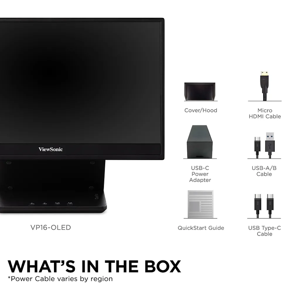 The ViewSonic ColorPro VP16-OLED is a 15.6” portable monitor with native Full HD 1080p resolution and advanced OLED technology for incredible visual performance on the go. The VP16-OLED is Pantone Validated and factory calibrated to deliver richer color uniformity and enhanced details, ensuring that it meets the demands of professional content creators. A flexible and foldable ergonomic stand delivers easy height adjustment for the perfect viewing angle in a variety of environments. A convenient tripod mount is integrated into the stand so that the display can be used as a high-quality photo or video preview screen for fine adjustments in the field, while a protective screen cover also doubles as a shading hood for a “dark room” effect. In addition, versatile connectivity options include two USB-C ports for 2-way charging, as well as micro HDMI and a headphone jack.