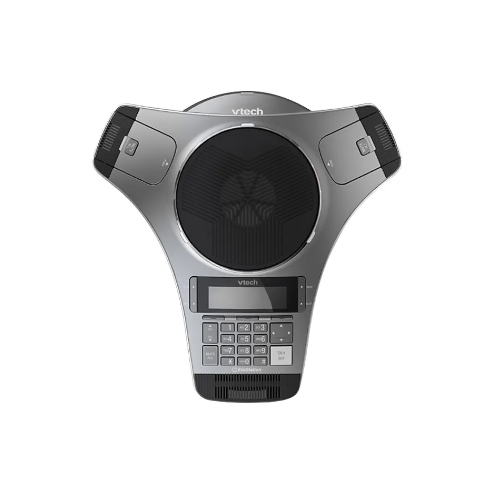 Free yourself from conference room wires, and help your team collaborate better. The VTech ErisStation analog wireless conference phone uses DECT 6.0 technology for a completely wireless conference experience. The system includes a DECT base with analog PSTN connection and docking station to charge the phone with up to 24 hours of talk time. And just place the two wireless microphones in the phone’s built-in charging bays to get them ready for the next call. The VCS712 2W allows total freedom for placement in your conference room, without tripping over wires. With wireless microphones, you’ll experience less frustration and more successful conversations. Need to accommodate a larger meeting? Easily add up to two accessory VCS850 DECT expansion wireless speakerphones to handle more active participants. Now, you and your team can clearly hear, spread out, and speak without shouting over the table.