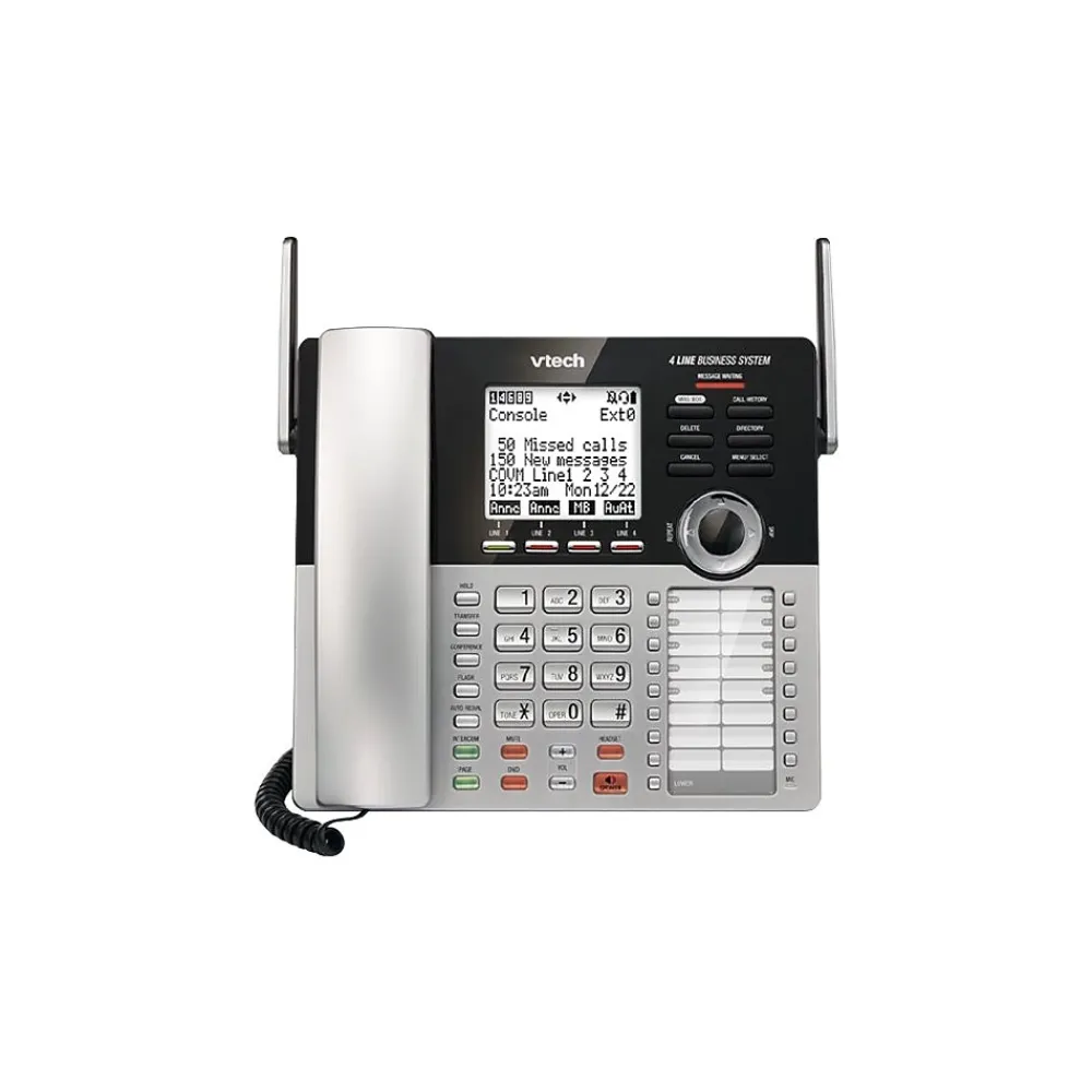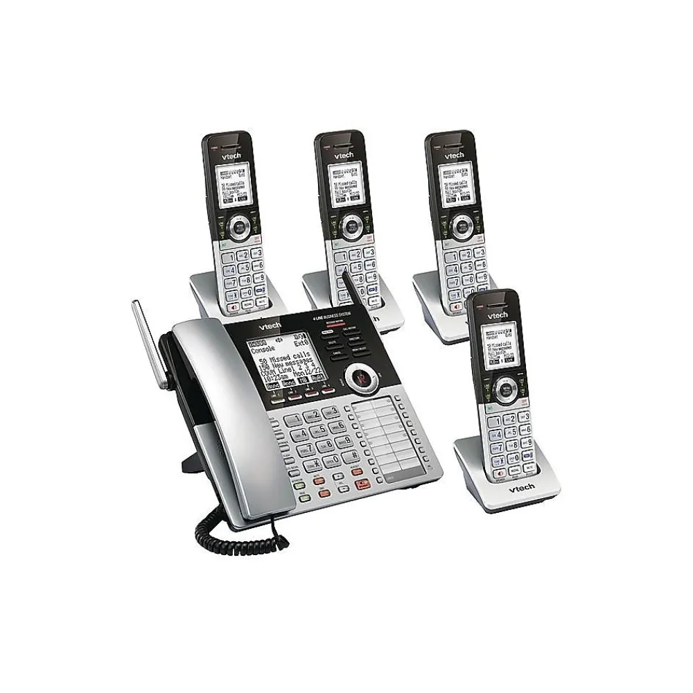 Stay in contact when important business opportunities arise by using this phone system bundle. This telephone and four cordless handsets support up to four lines with unique numbers, which makes it ideal for conference calls, and the digital technology DECT 6.0 provides clear communication. This VTech office phone Small Business System includes an integrated digital answering system to record messages when you step away from your desk.