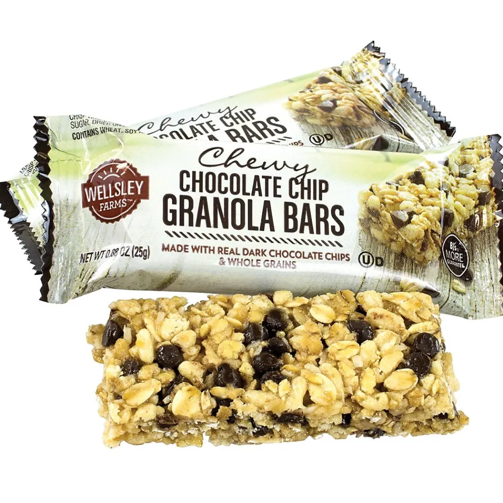 Made with real Dark Chocolate Chips and Whole Grains, this Wellsley Farms Chewy Chocolate Chip Granola Bars, .88 oz, 60 Count is packed with chewy, chocolaty and granola flavor. This 60 bar box is perfect for stocking in the employee break room, or in your desk at the office for an on-the-go snack. These granola bars are made with no high fructose corn syrup and no artificial flavors. With only 110 calories per bar, Wellsley Farms Chewy Chocolate Chip Granola Bars, .88 oz, 60 Count is the healthy snack you’ve been looking for, without missing out on any delicious chocolate flavor!