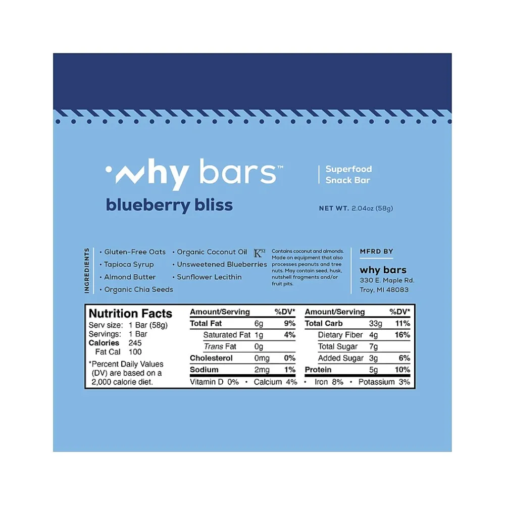 - Ingredients: gluten-free oats, almond butter, unsweetened dried blueberries, organic coconut oil, organic chia seed, sunflower lecithin