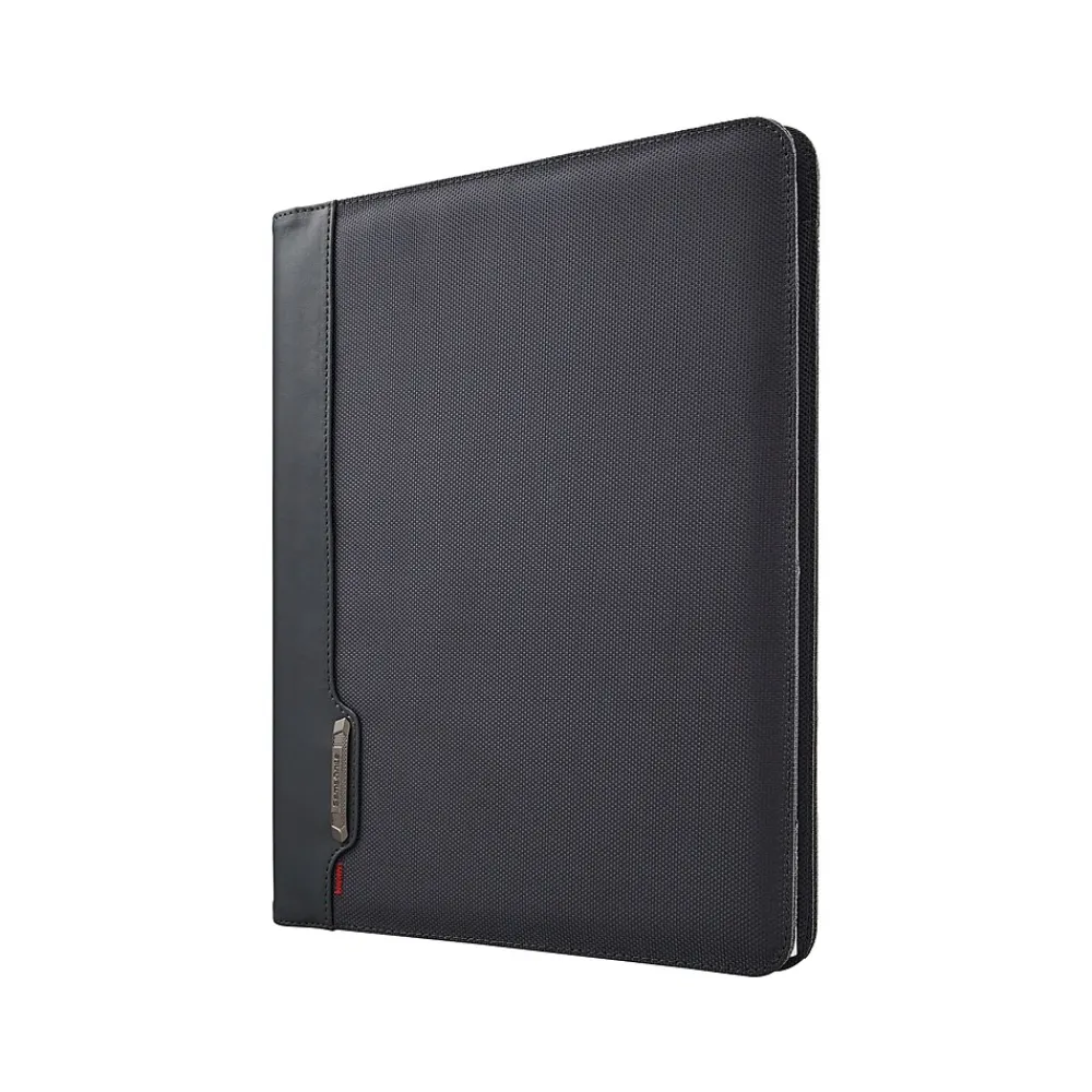 - Features: document sleeve, pen loop, business card holders, matte gunmetal logo