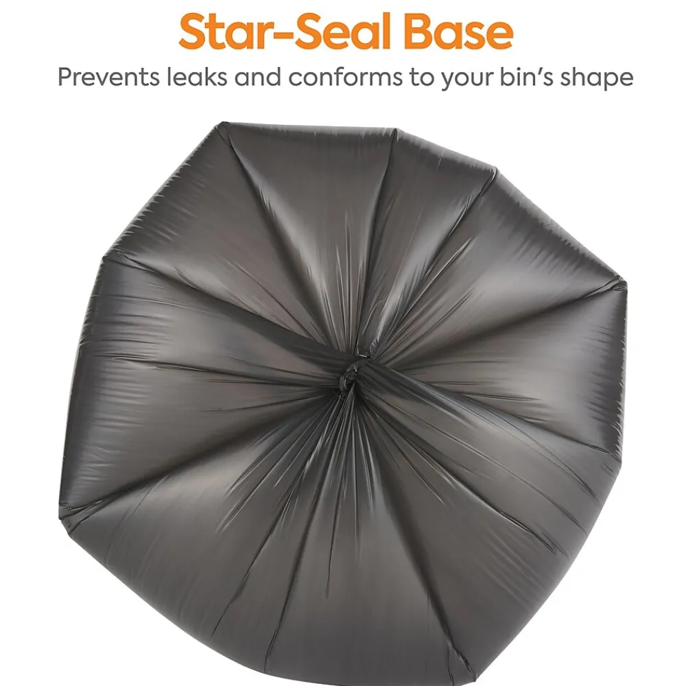 Enjoy easy storage with these low-density trash bags. A dual opening allows vertical or horizontal access, and the black color keeps contents concealed for discretion. Designed for industrial waste disposal, these heavy-strength 0.35-mil garbage bags hold sharp and wet objects without leaks or tears. The star-shaped bottom on these Coastwide Professional™ trash bags allows the liner to take the shape of the waste bin, leveling trash for easy lifting.